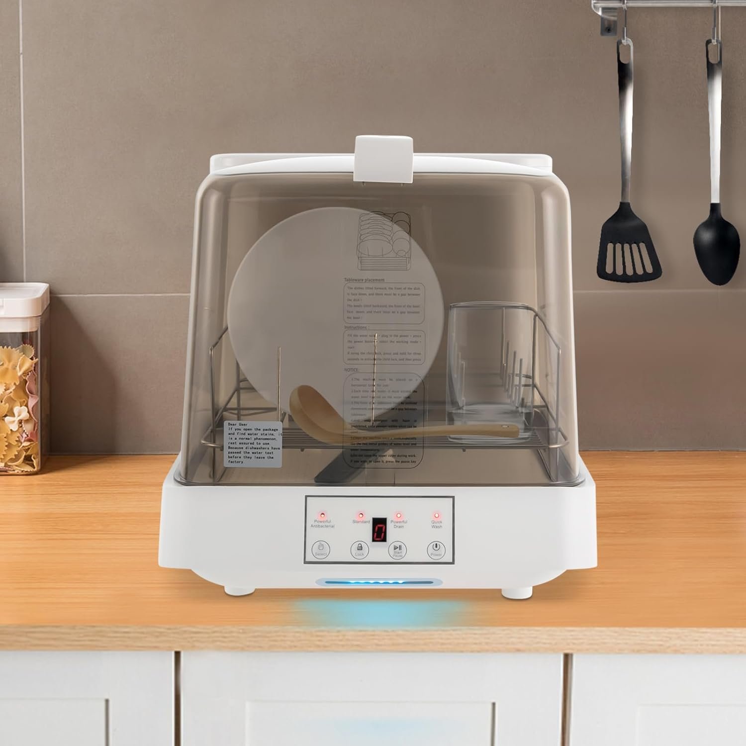 This modern, compact dishwasher is designed to provide comprehensive cleaning with its 360° rotating spray and 1.59gal large capacity water tank. The dishwasher features a touch control method, allowing for easy operation and selection of the suitable mode for different needs. It comes with multiple cleaning modes, including Standard Wash, Quick Wash, and Fruit & Vegetable Wash.