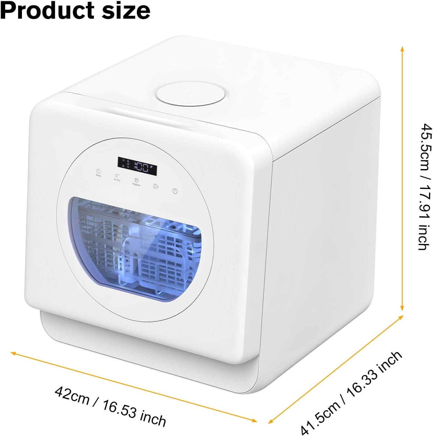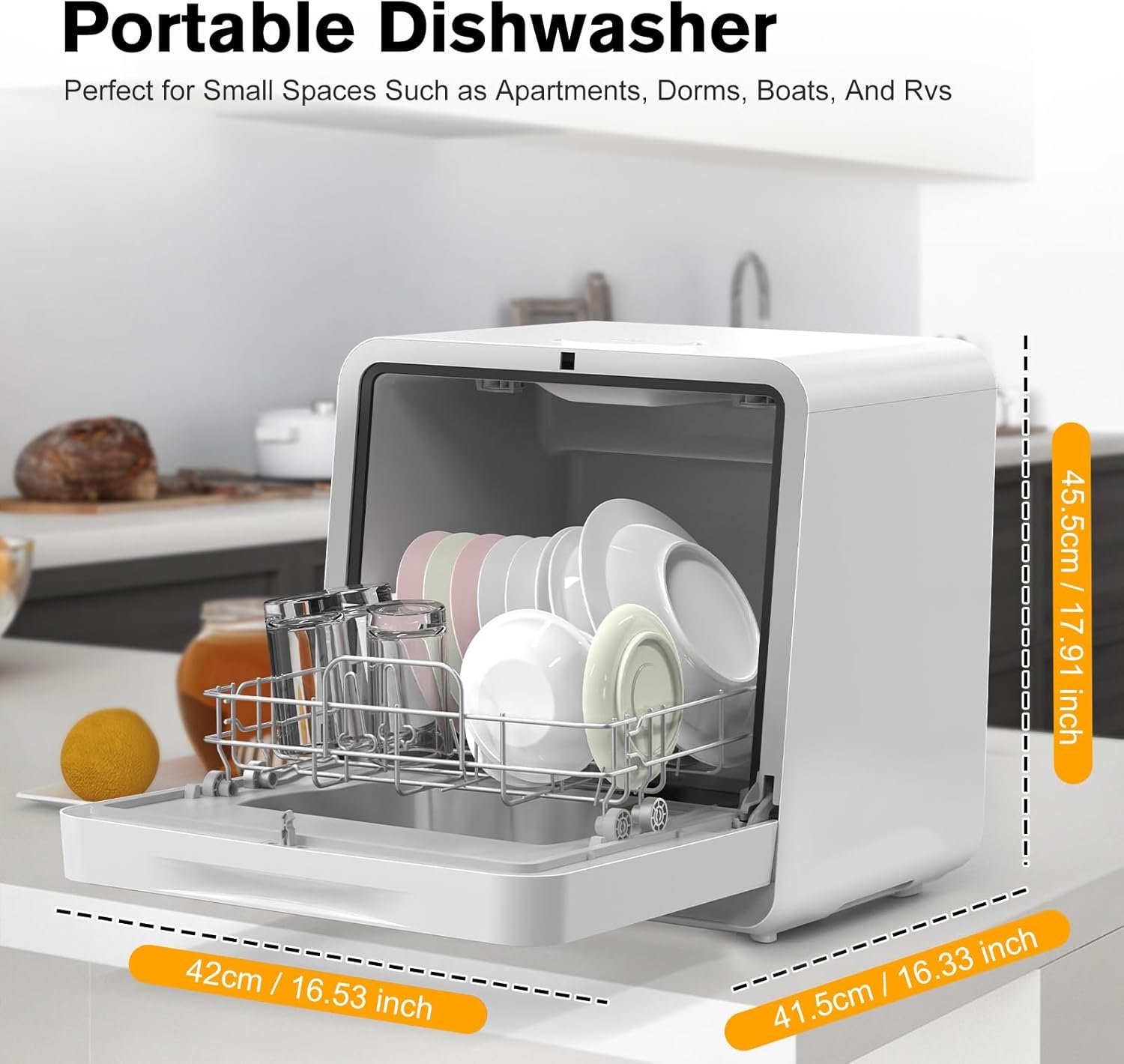 Our compact dishwasher is specifically designed for small kitchens or limited countertop spaces. Its compact form factor (17.9 x 16.3 x 16.5 in) fits seamlessly into any kitchen setup without compromising on performance. The key features of our countertop dishwasher include: