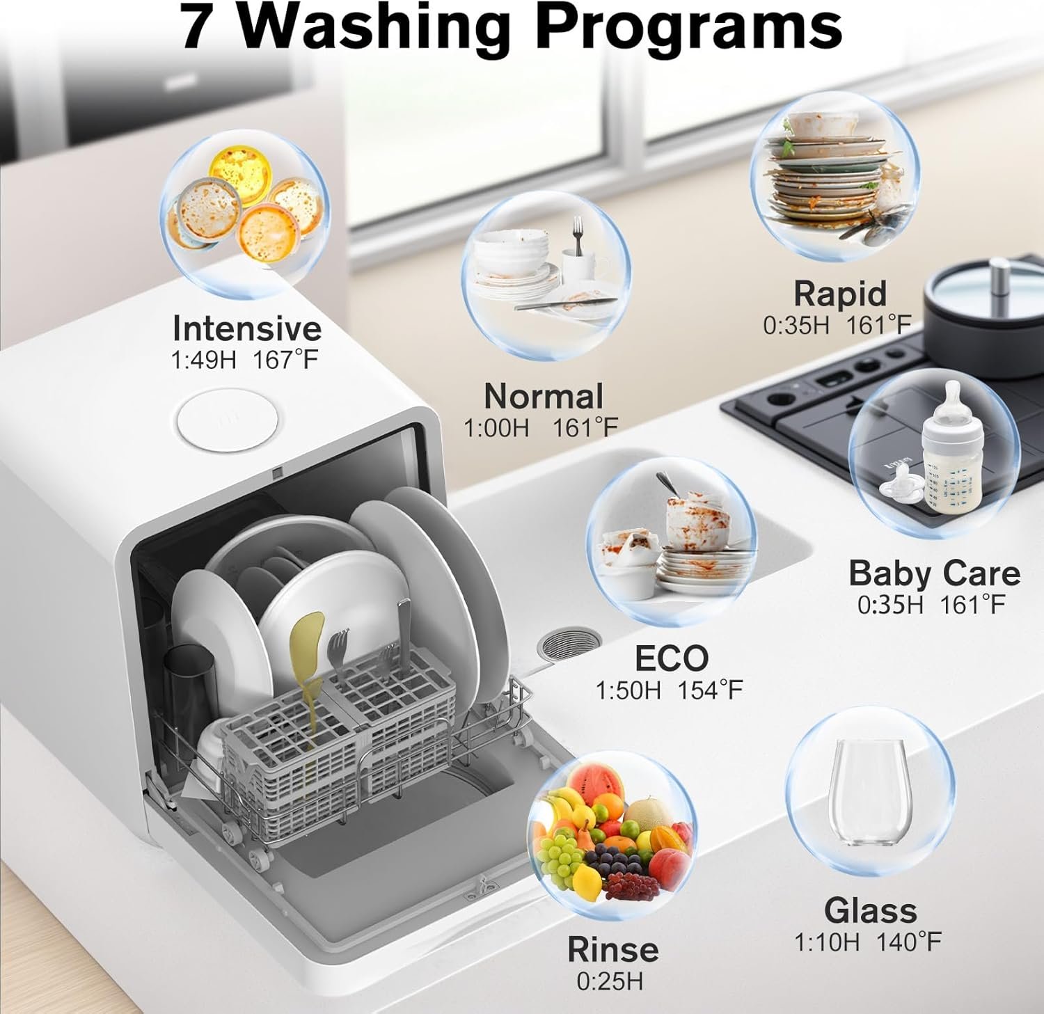 Our compact dishwasher offers 7 programs to cater to different needs: