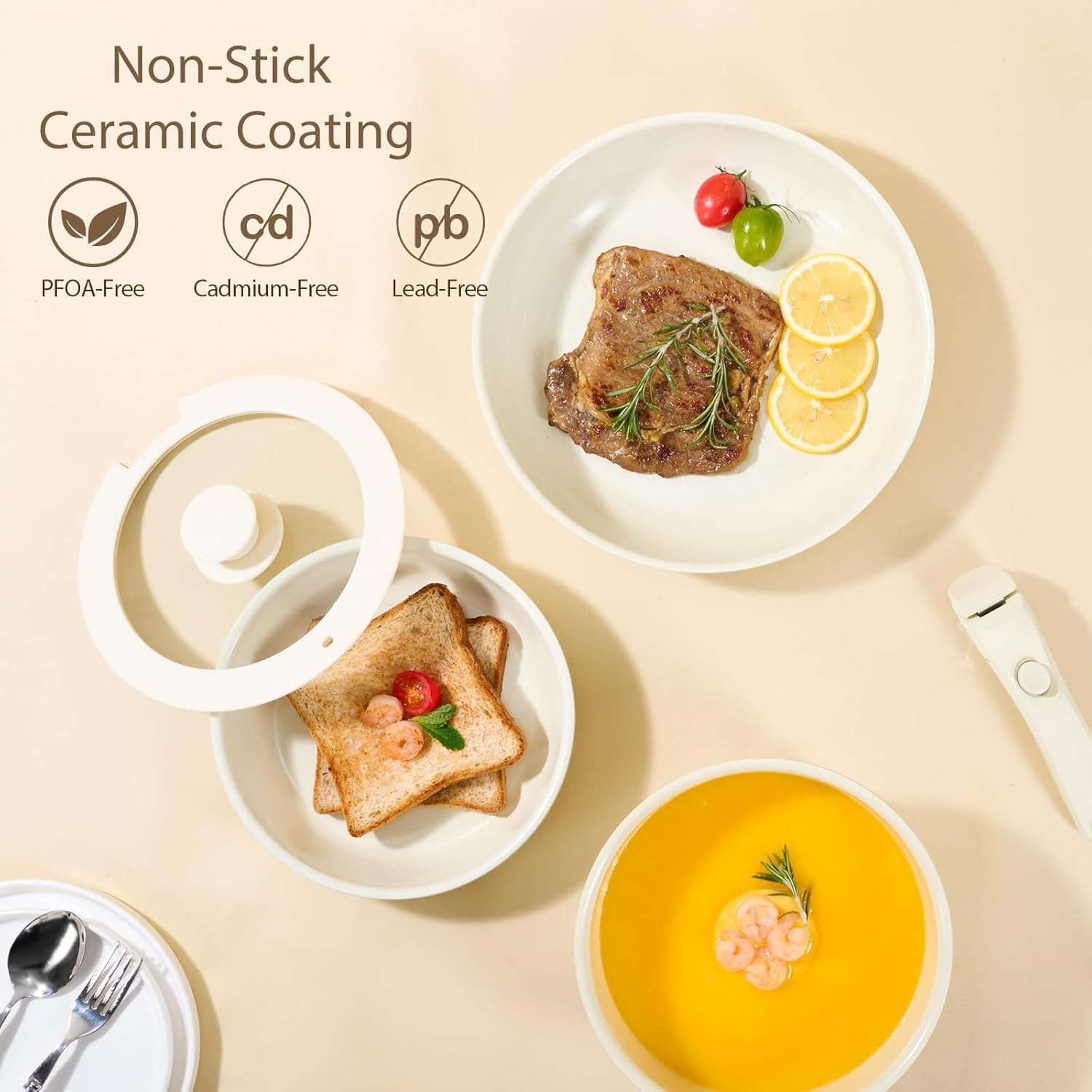 - Complete Set Includes: 2-qt saucepan, 3-qt saucepan, 8” frying pan, 10” frying pan, 4-qt saute pan, 2*silicone lids, 2* PE sealing cover, 2*detachable handle, 2pcs utensils set, and 3*pot protector.