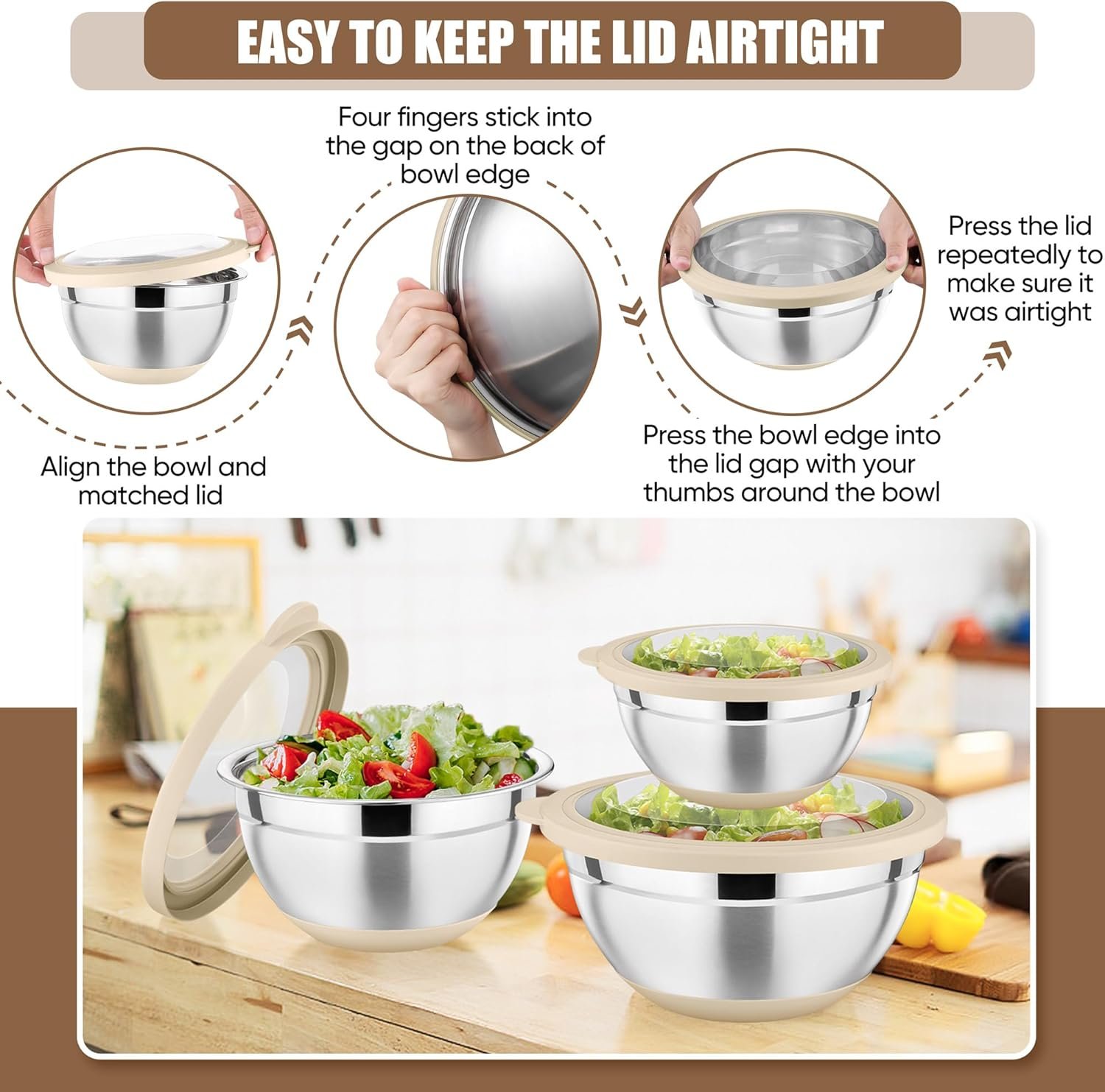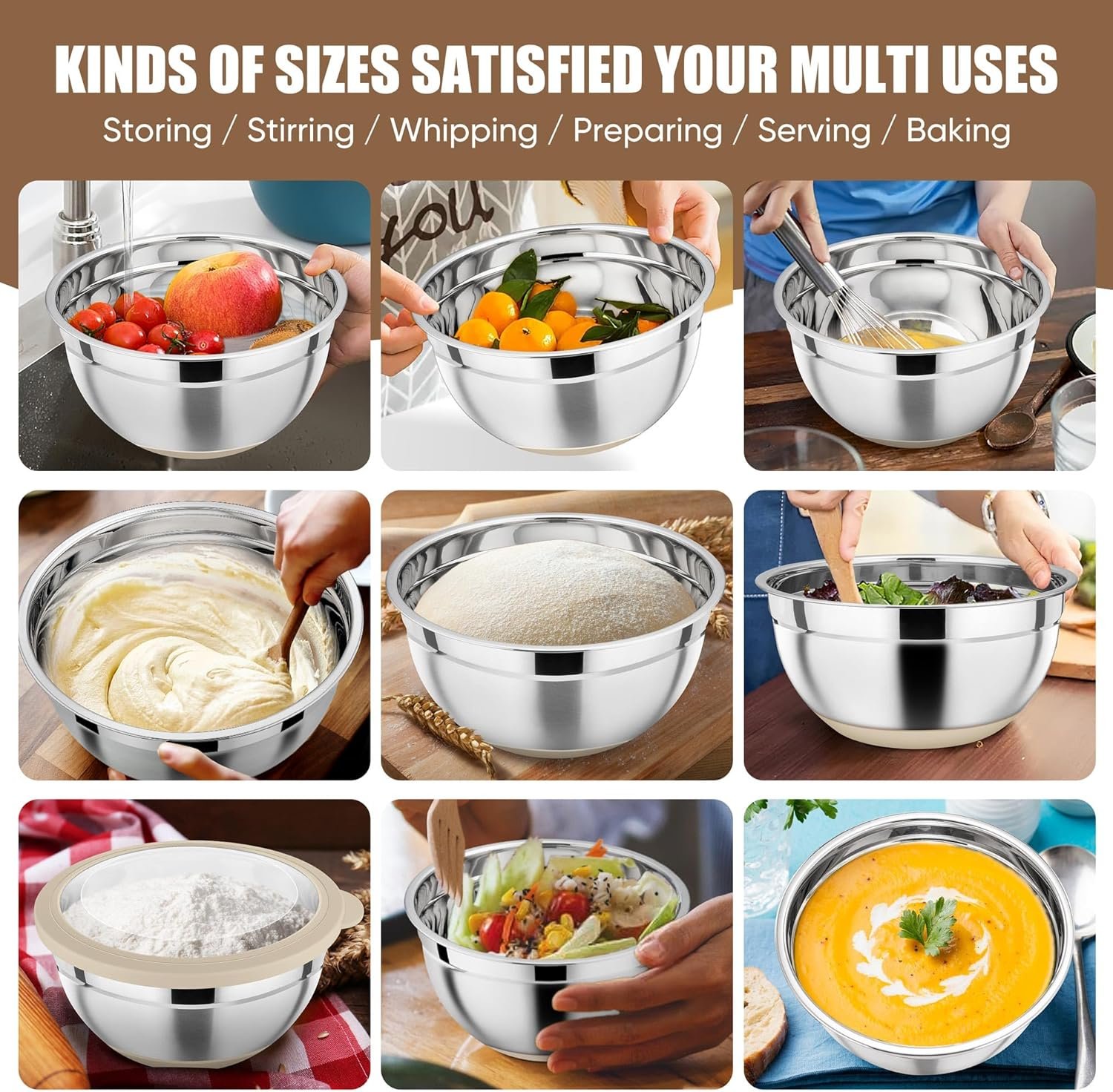 The metal mixing bowls set of 6 can satisfy various demands, including prepping food, mixing salad, kneading dough, whisking eggs, washing fruits or vegetables, and more. The set is great for home kitchens, restaurants, or outdoor camping, and the khaki lids and bottoms and shiny silvery stainless steel bowl body are a popular choice for various kitchen styles.