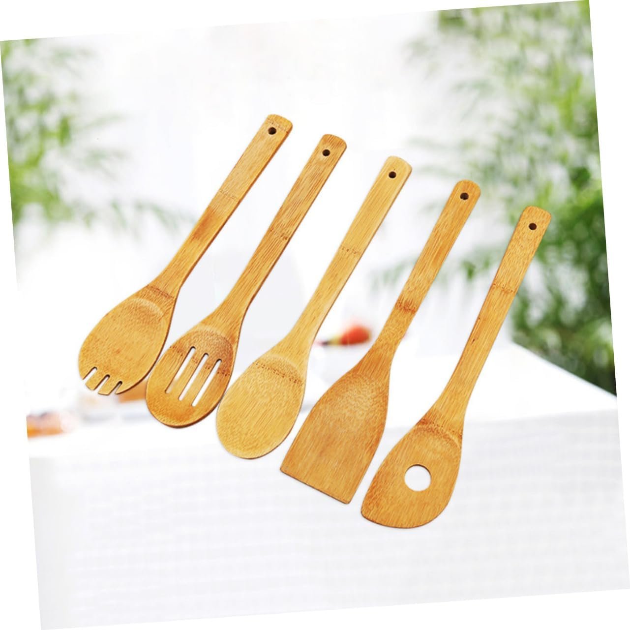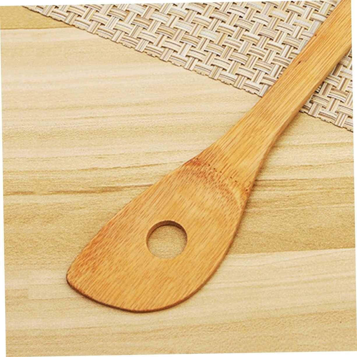 This 5-piece wooden kitchen utensil set is designed to satisfy all your cooking and baking needs. The set includes a turner spatula, single hole mixing spoon, slotted spoon, spoon, and rounded fork, making it a well-organized and essential tool for your kitchen.