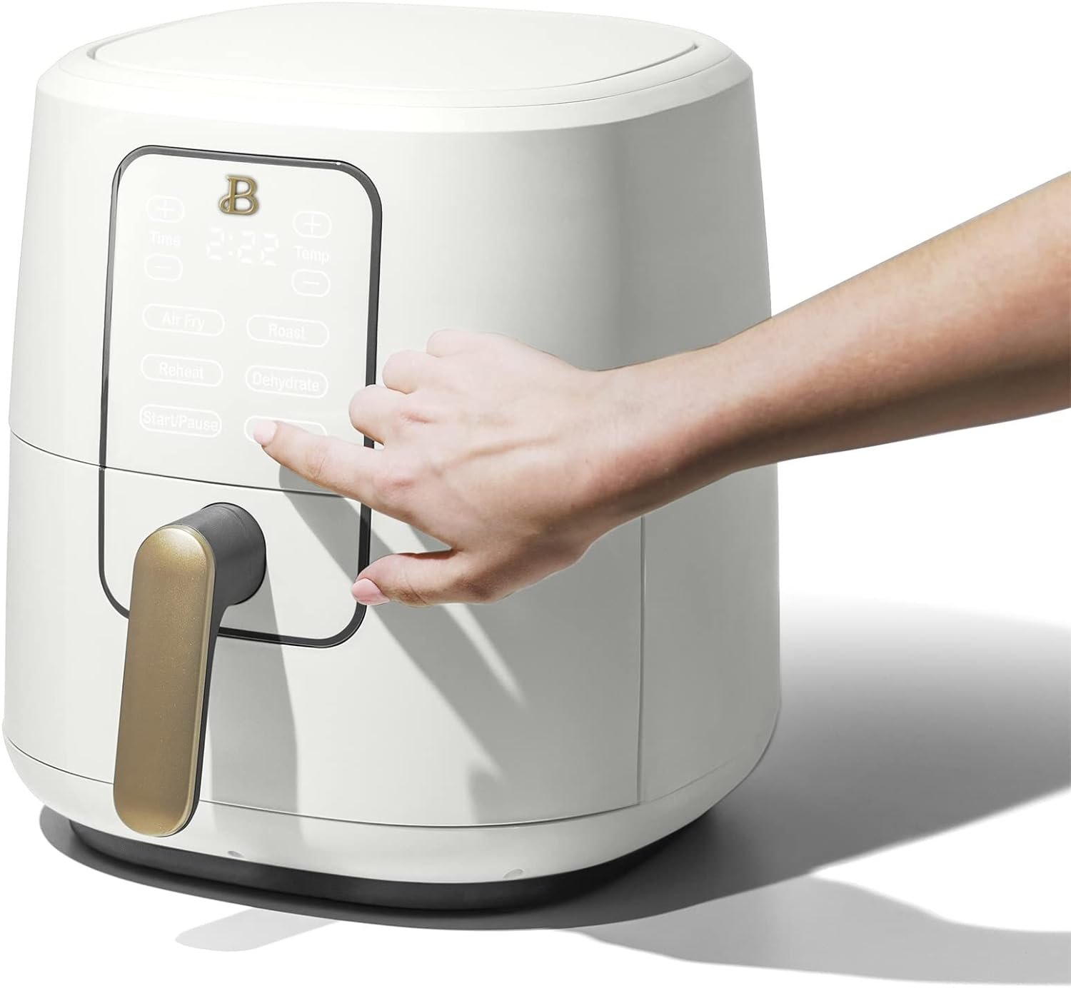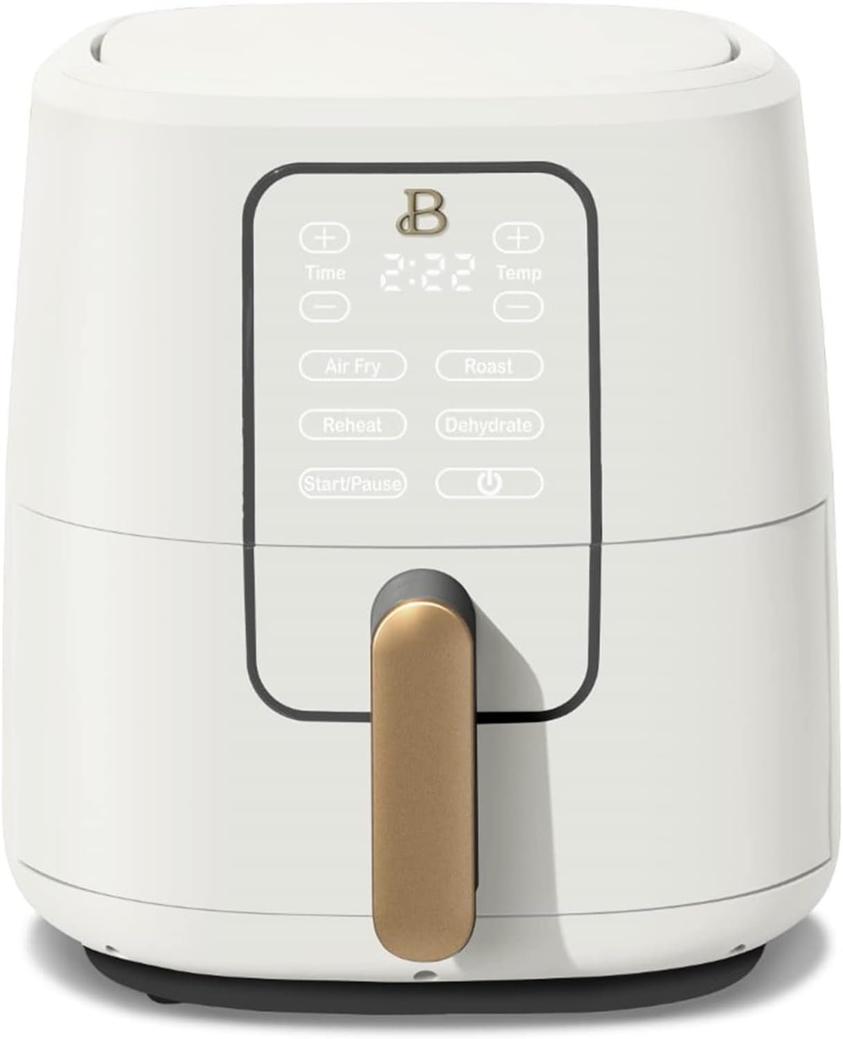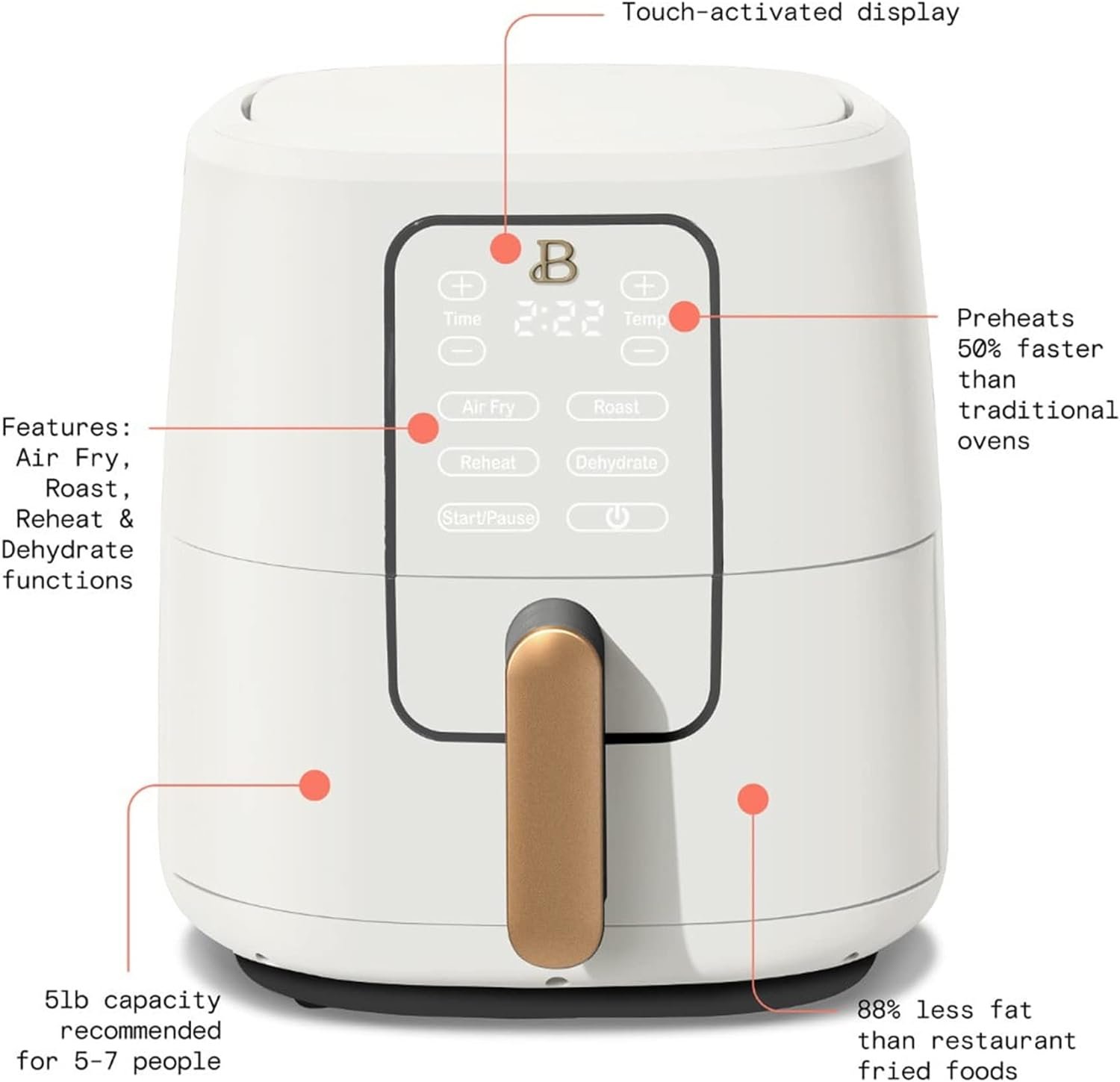 Thoughtfully designed with sleek touch-activated illumination and signature gold accents, this Air Fryer combines elegant design, contemporary colors, and modern silhouettes for high-performance appliances that look beautiful on your kitchen counter. It preheats food up to 50% faster than a traditional oven, with a 5lb food capacity ideal for serving 5-7 people.