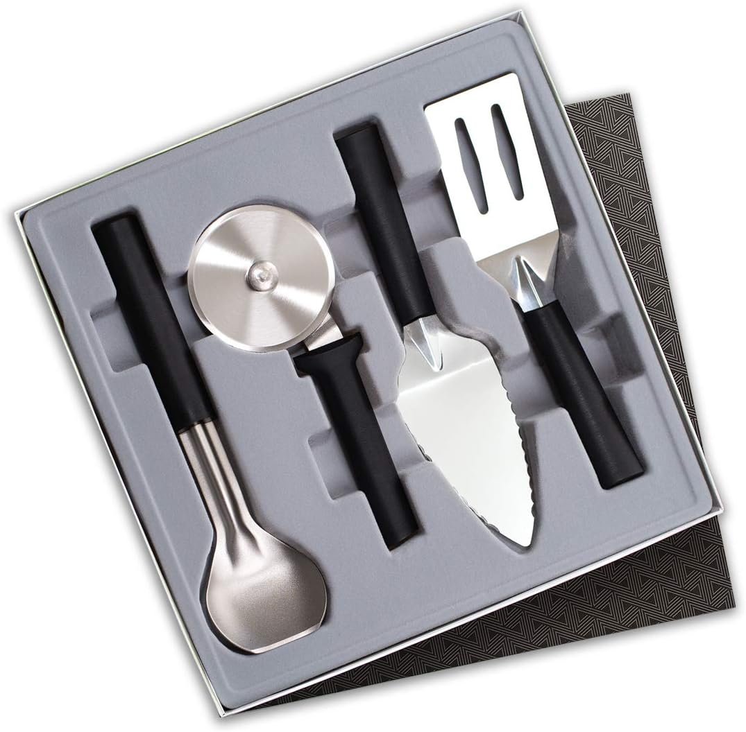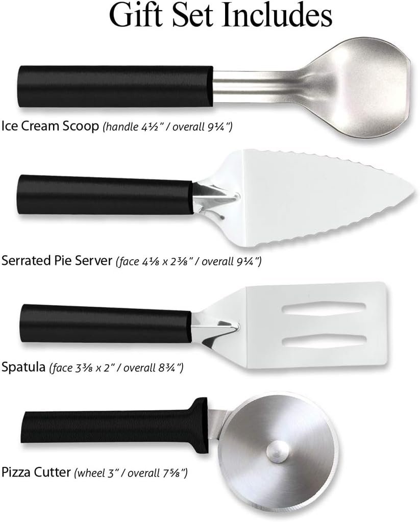 This super-handy 4-piece set is a must-have for any kitchen, including an Ice Cream Scoop, Pizza Cutter, Serrated Pie Server, and Spatula. Each item in the set is carefully packaged in a form-fitting liner and placed inside an attractive gift box, making it ready to give as a present with just the addition of a bow.