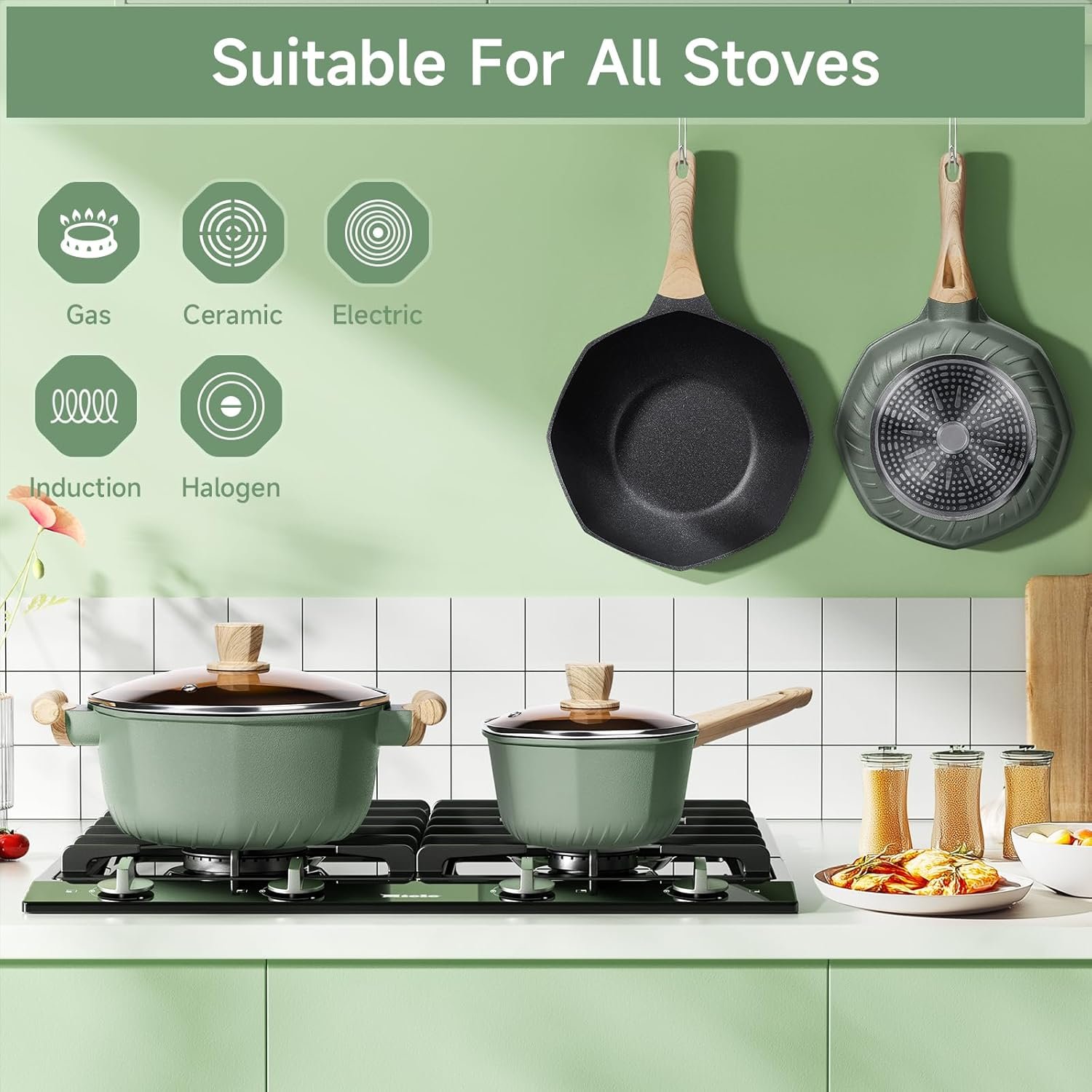 This set is suitable for electric stovetops, gas, induction, halogen, furnaces, and almost all types of stovetops.