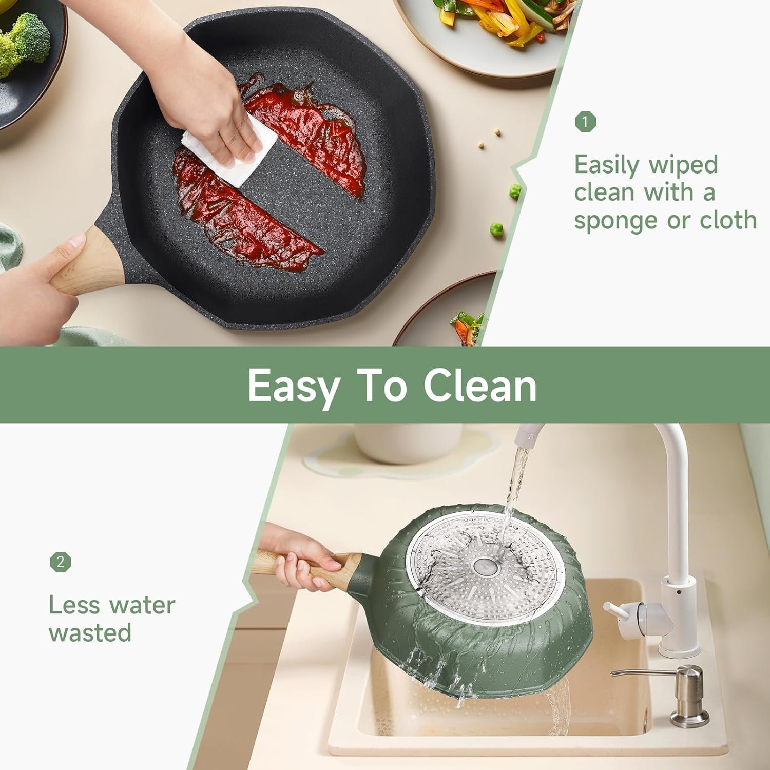 Simply wipe with a paper towel or rinse with water—less water is wasted. The non-stick coating allows food to slide smoothly, making cooking easier while enhancing the flavor of your meals.