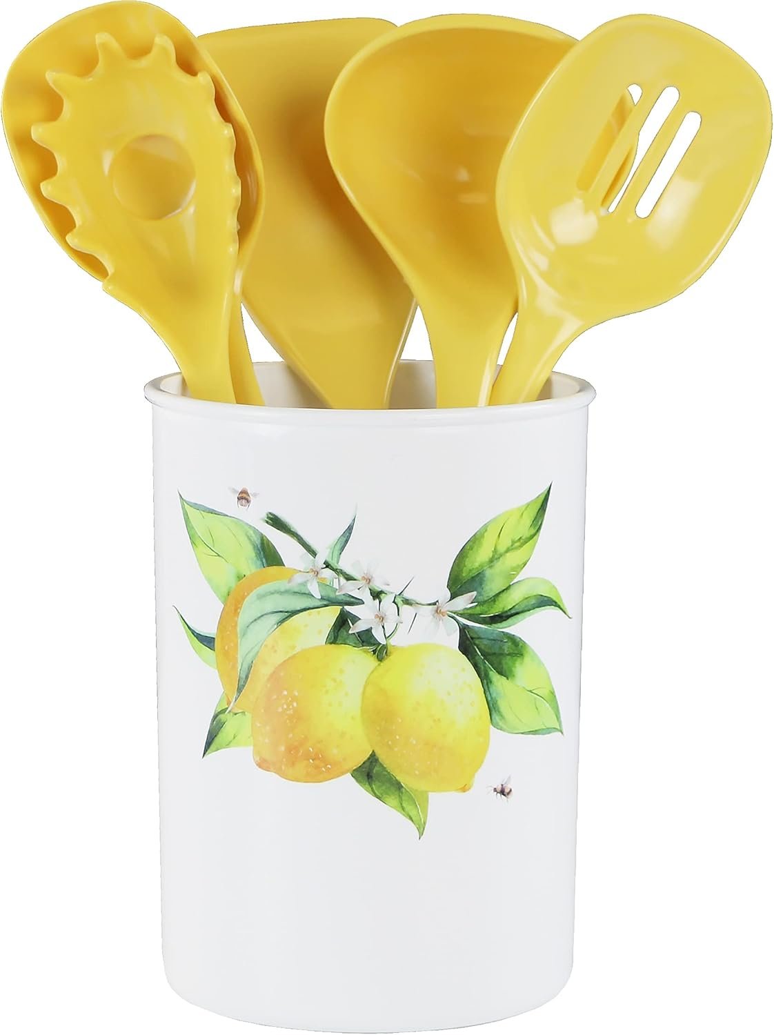 The kitchen utensil holder is a handy tool that allows you to keep all your essential utensils within reach while cooking. Made from food-safe, BPA-free plastic, this holder is not only functional but also adds a pop of color to your kitchen décor. It comes with a 5-piece utensil set, each made of 100% melamine, which is heat safe up to 250°F, making it perfect for use with non-stick pans and surfaces.