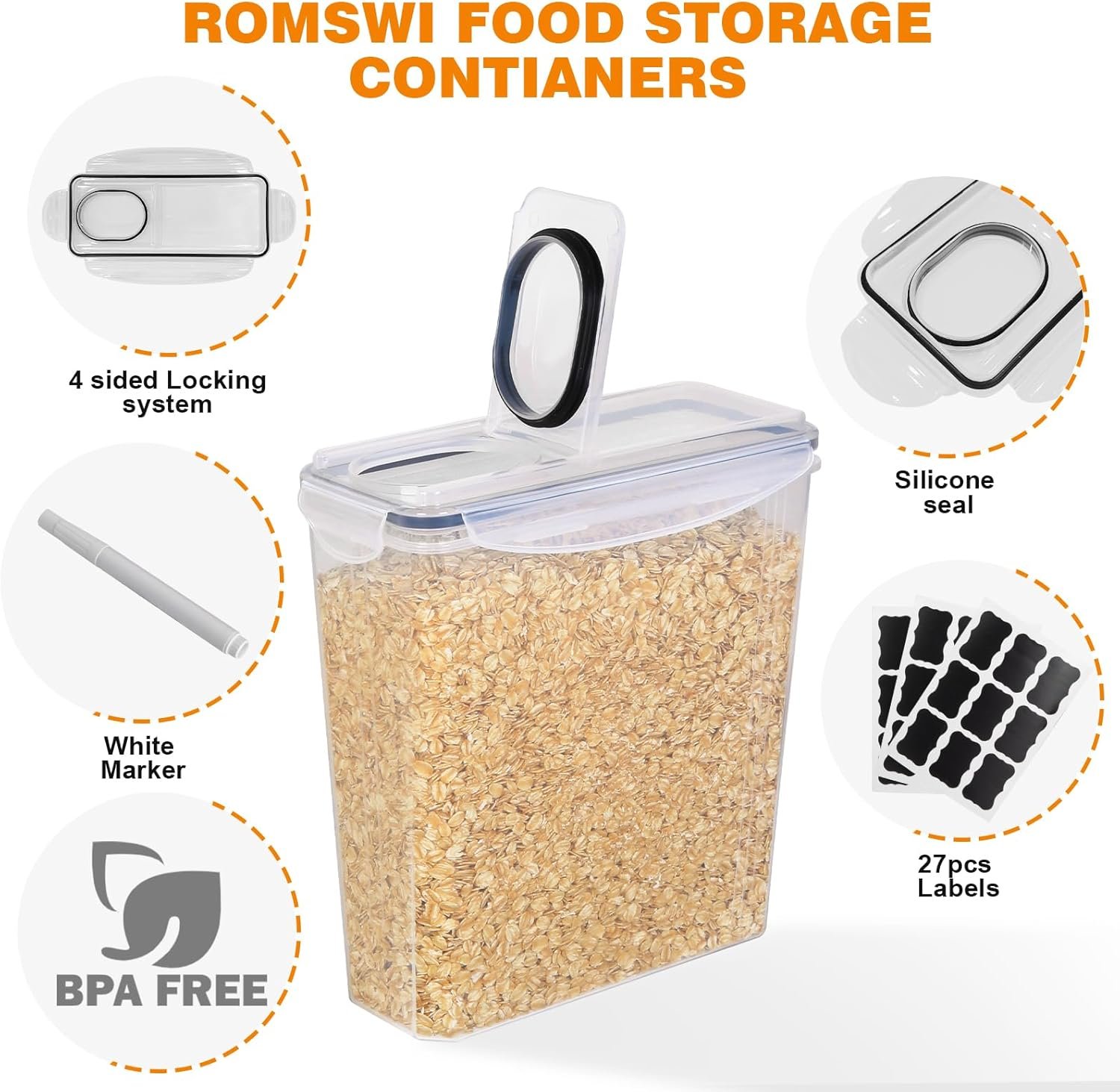 Romswi Airtight Food Storage Containers with Lids,24Pcs Pantry Organizers and Storage,BPA Free Cereal Containers Storage with 27 Labels and 4 Spoons,for Rice,Flour,Sugar and Noodles