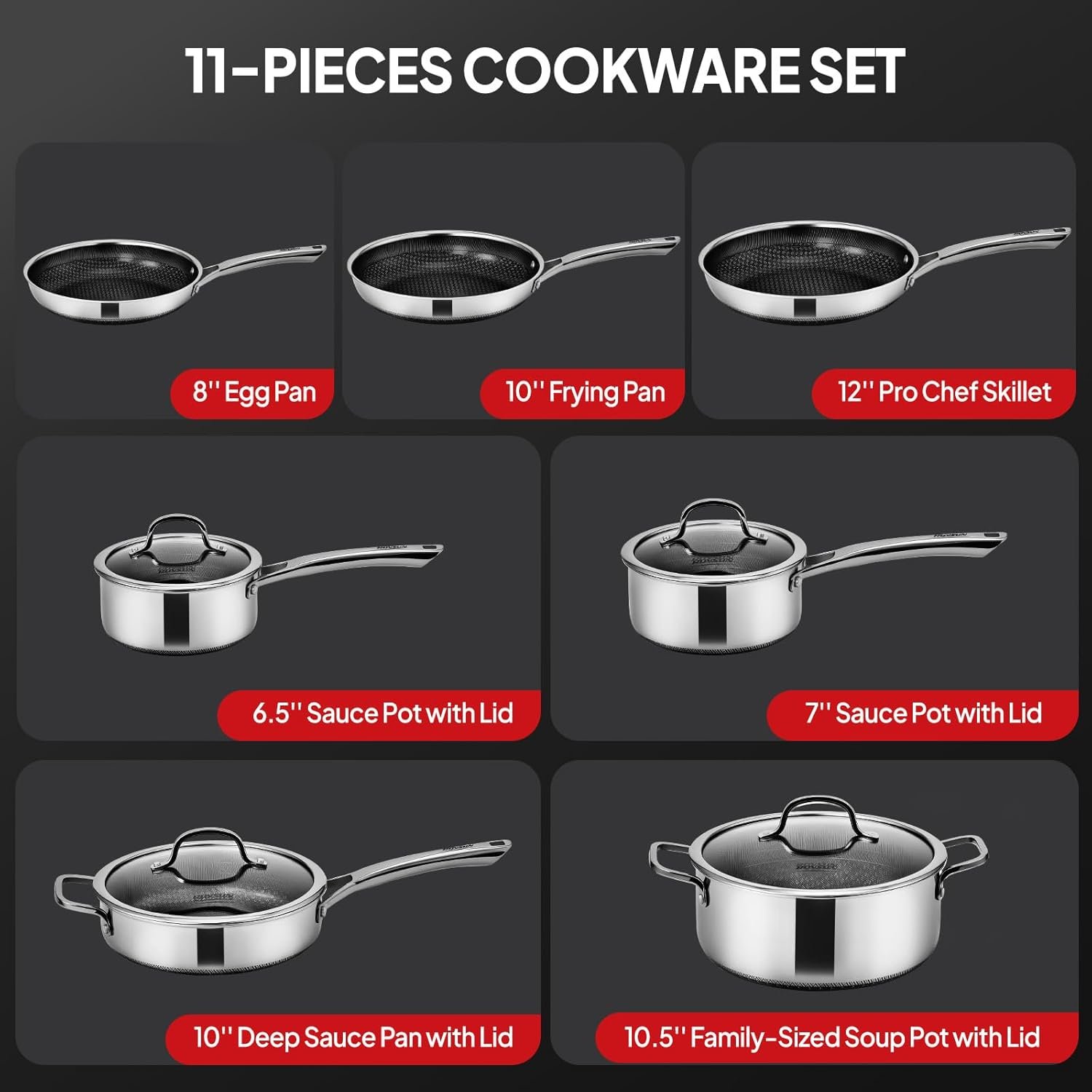 This complete set includes an 8″ egg pan, 10″ frying pan, two sauce pots (6.5″ & 7″) with lids, a 10″ deep sauce pan with lid, and a large 10.5″ family-sized soup pot with lid. It provides the perfect pot or pan for every cooking task, from frying eggs to preparing family meals, offering great value and convenience.