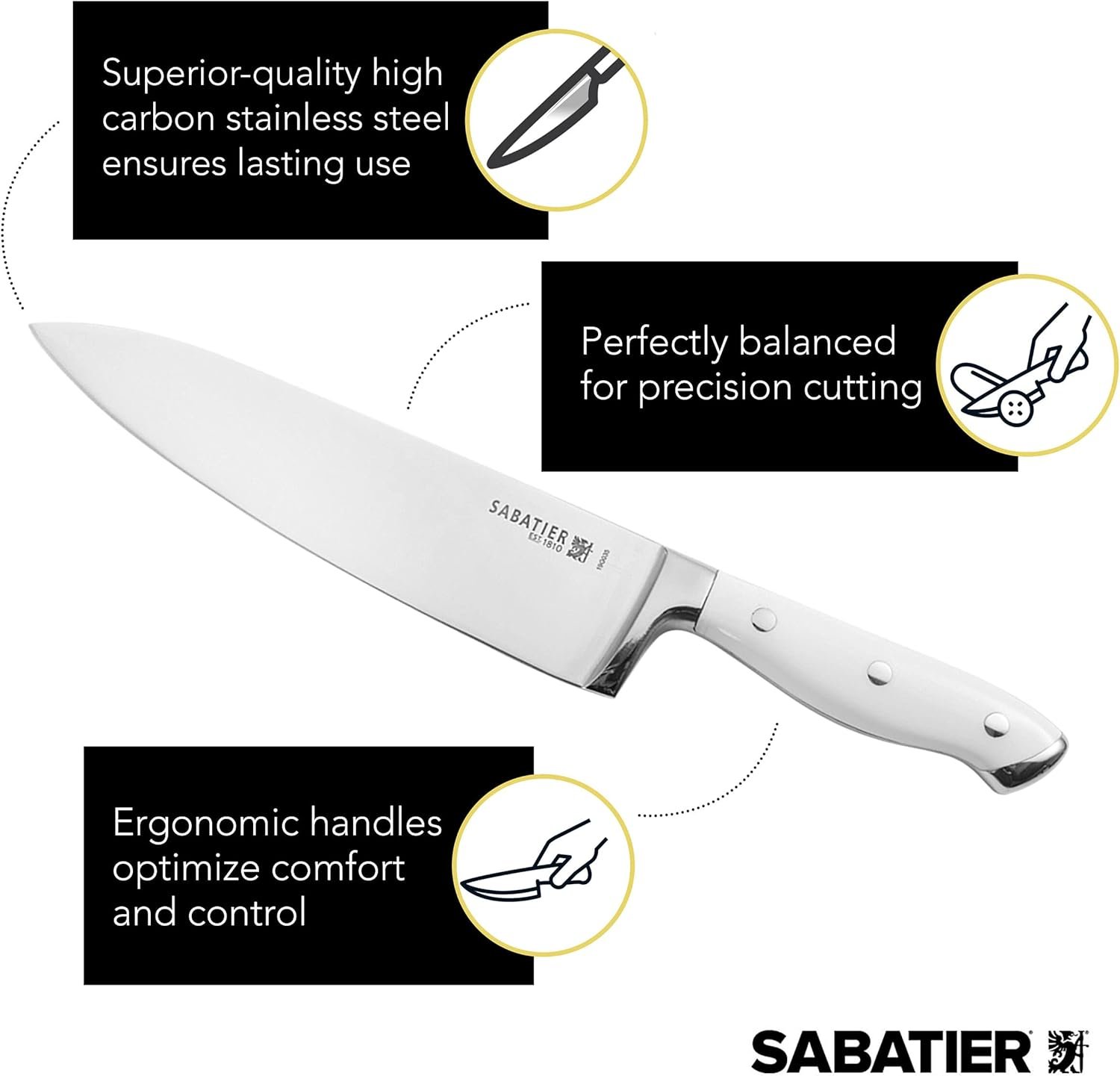 Be the first to review “Sabatier 15-Piece Forged Triple Rivet Knife Block Set, High-Carbon Stainless Steel Kitchen Knives, Razor-Sharp Knife set with Acacia Wood Block, White Handles” Cancel reply
