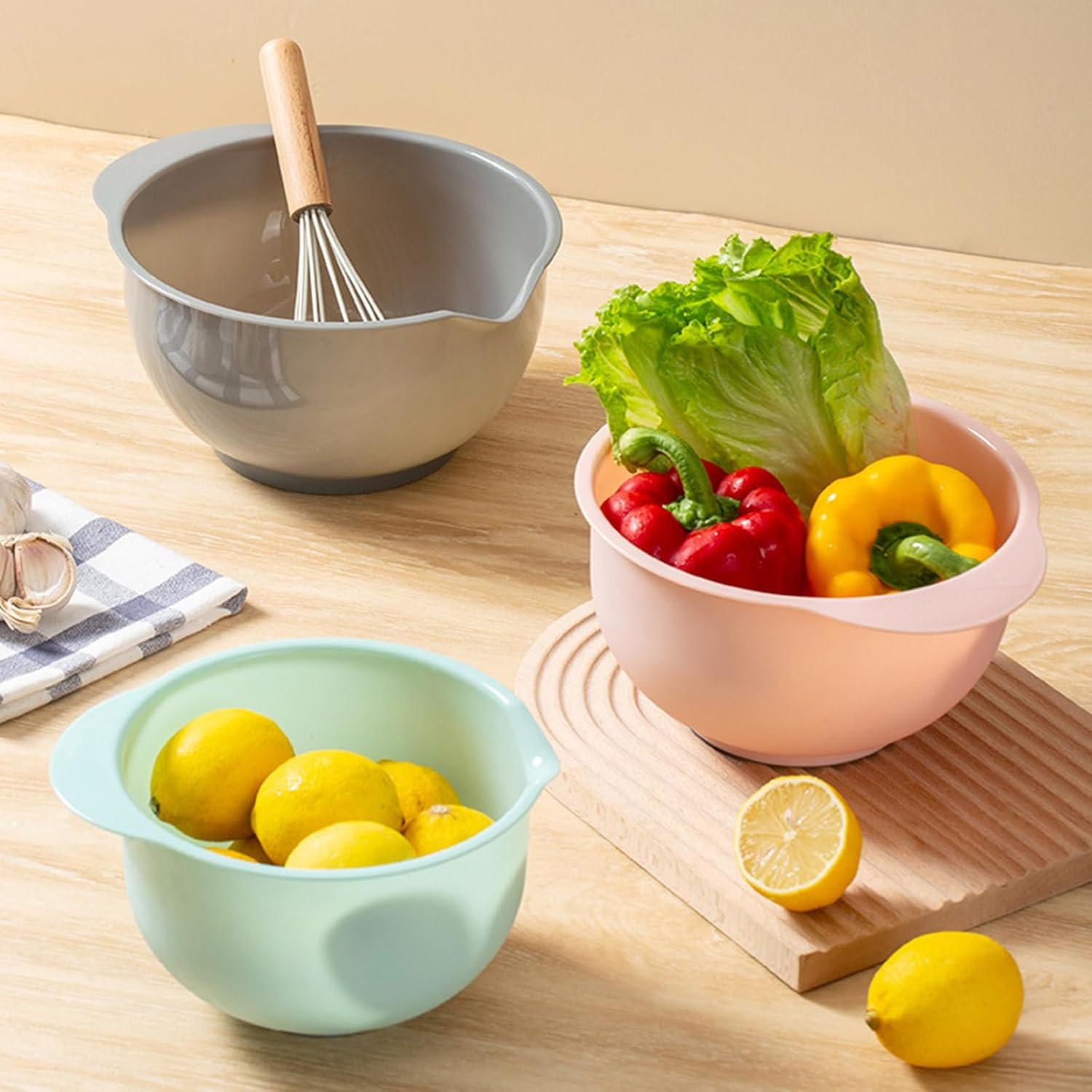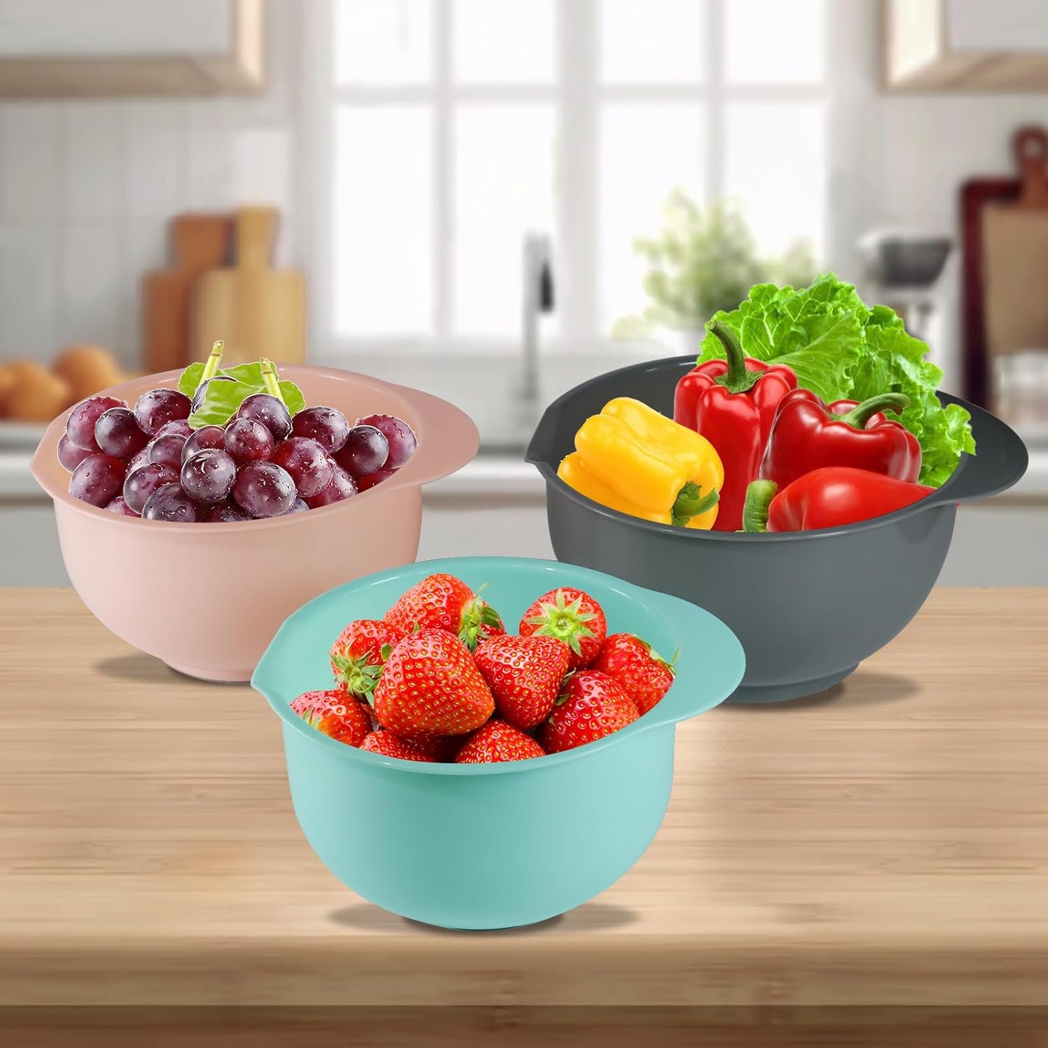 Our 3-piece mixing bowl set is a good helper for the kitchen, perfect for preparing pasta, potatoes, broccoli, green beans, carrots, and almost all food. The set includes three bowls of different sizes, making it ideal for various cooking tasks.