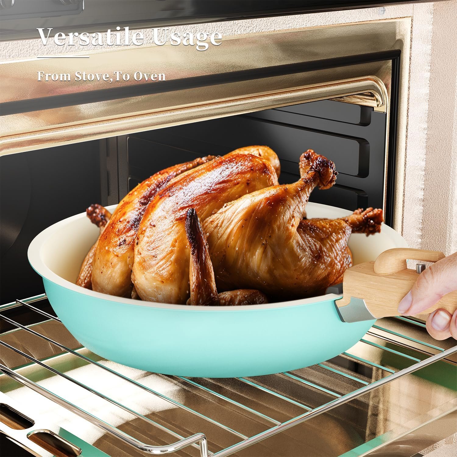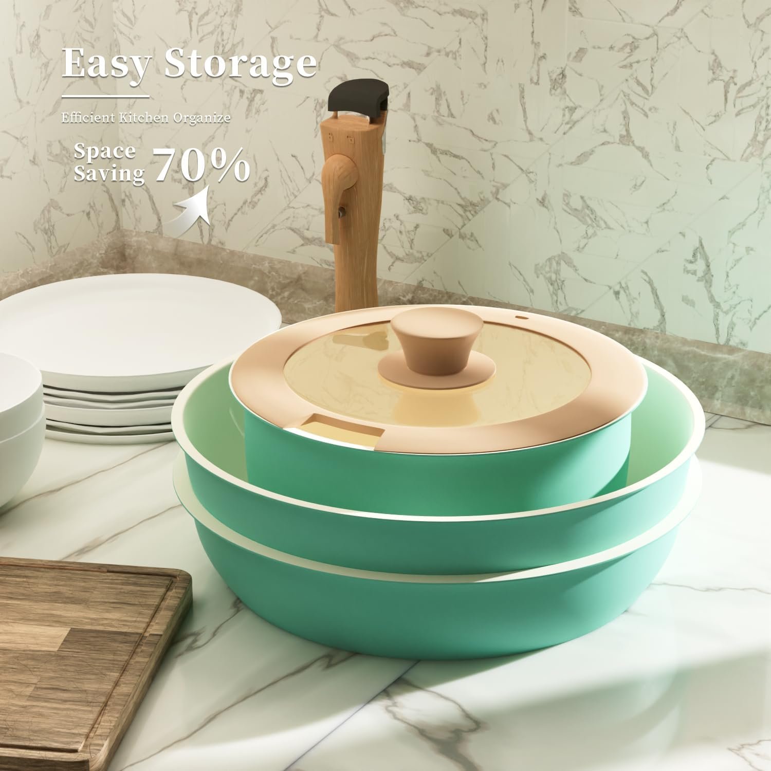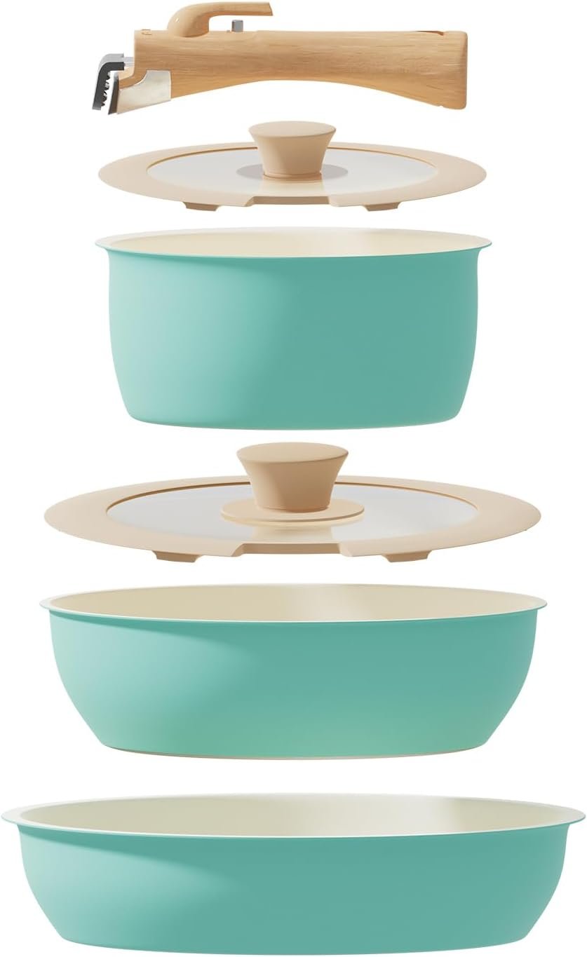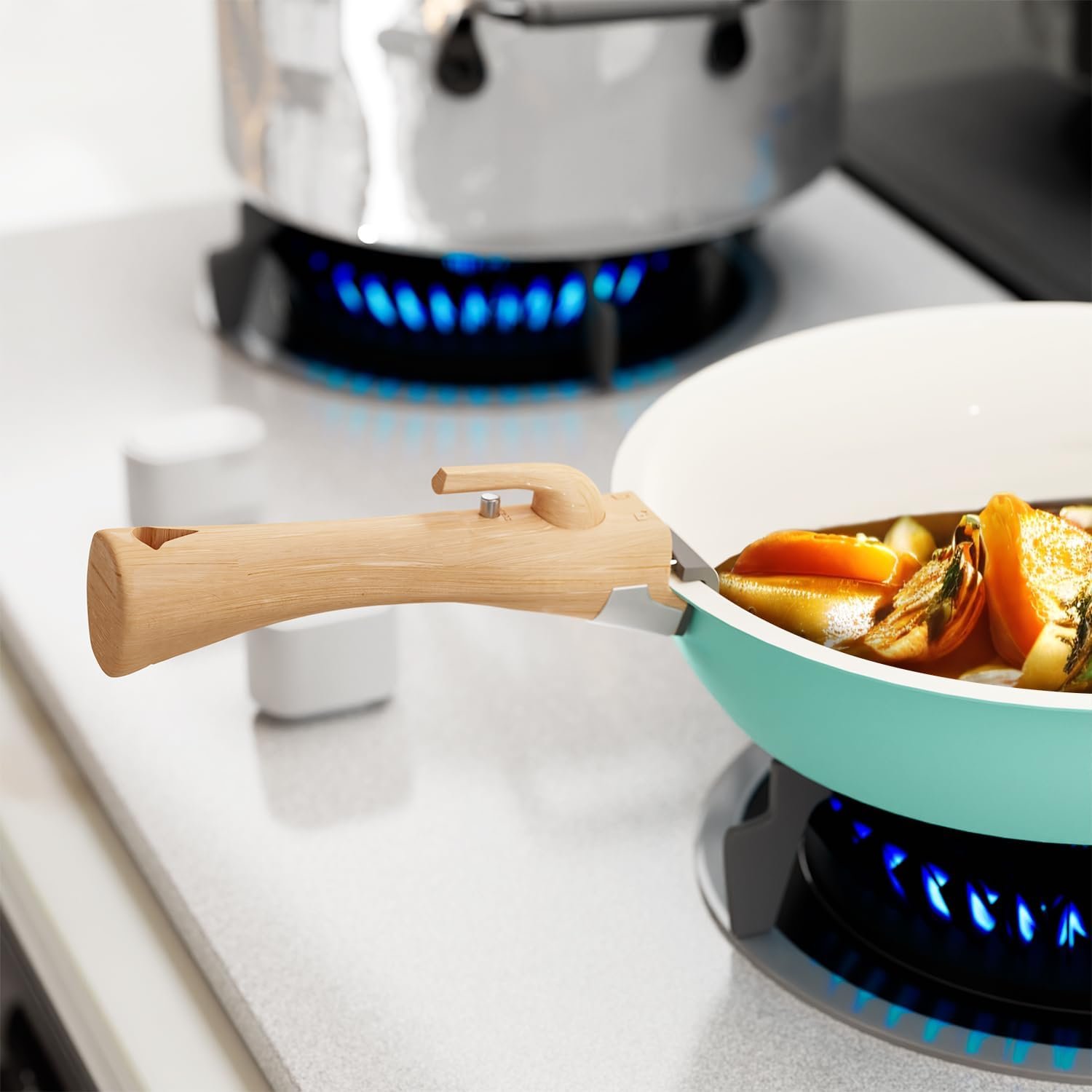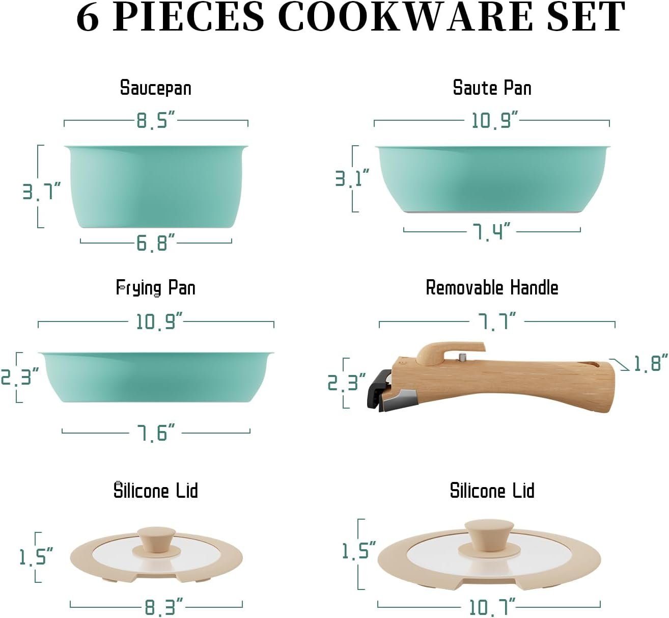 - Package includes 10.9-inch frying pan, 10.9-inch wok, 2.5-quart stew pan, 8.3-inch glass+silicone material pot lid, 10.7-inch glass+silicone material pot lid, and detachable handle
