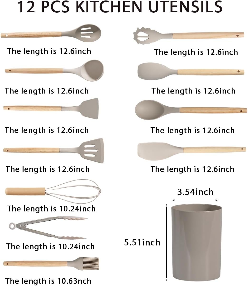 Home Cooking Utensil Sets Silicone Cooking Utensil Set,12 PCS Cooking Cookware Kitchen Utensils Set, Nonstick 446°F Heat-Resistant Cookware Kitchen Tools of Spatula,Turner Tongs,Spoon,Brush,Whisk, (khaki)