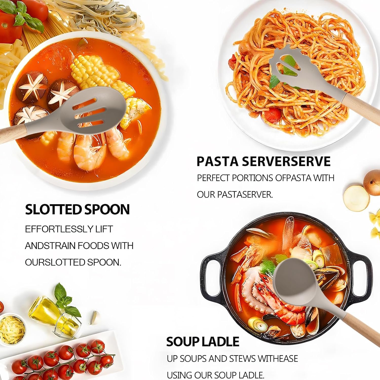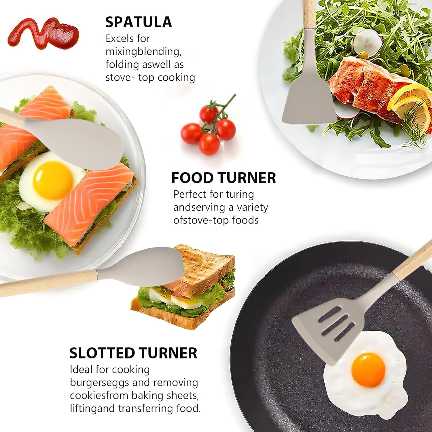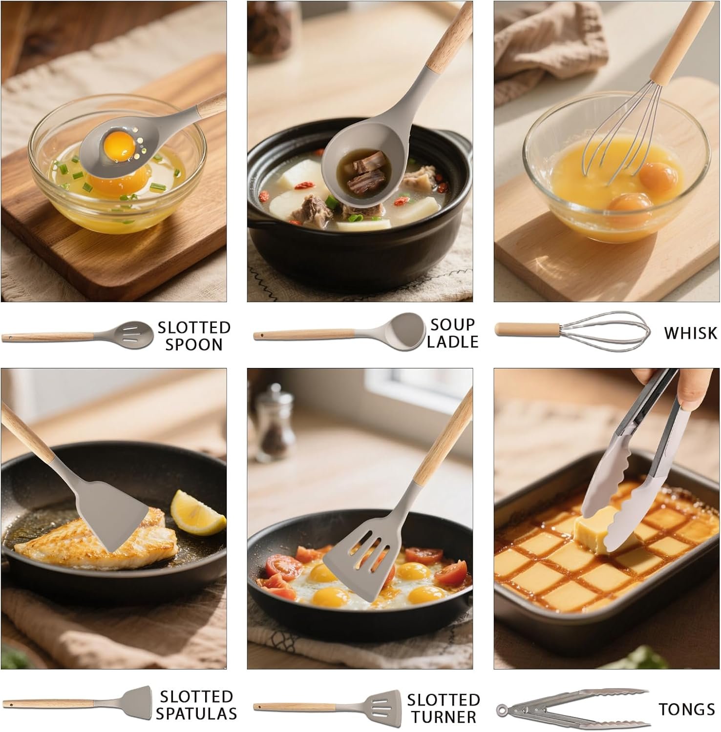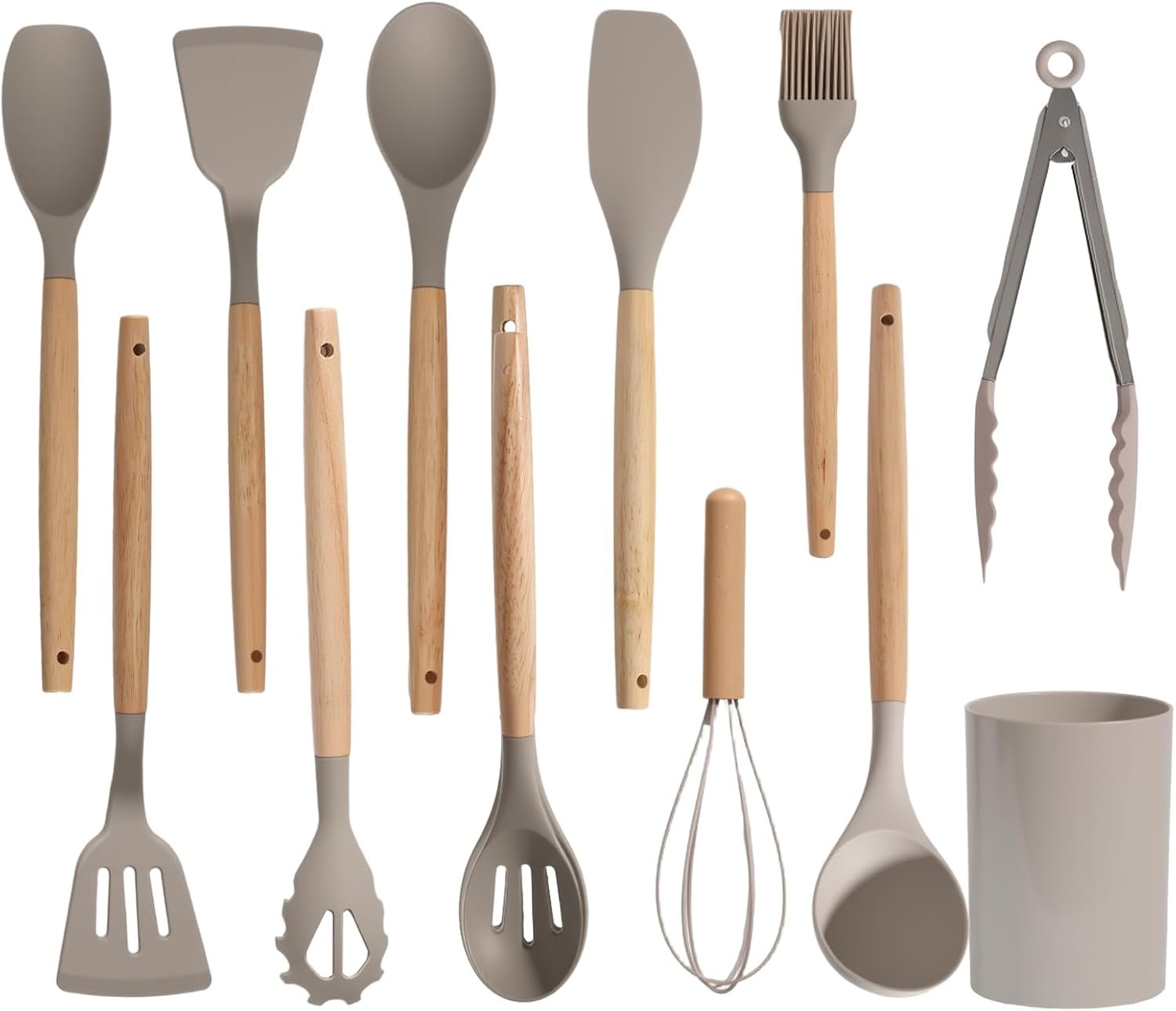 Silicone Cooking Utensils Set – 446°F Heat Resistant Silicone Kitchen Utensils for Cooking,Kitchen Utensil Spatula Set w Wooden Handles and Holder, BPA FREE Gadgets for Non-Stick Cookware (Khaki)