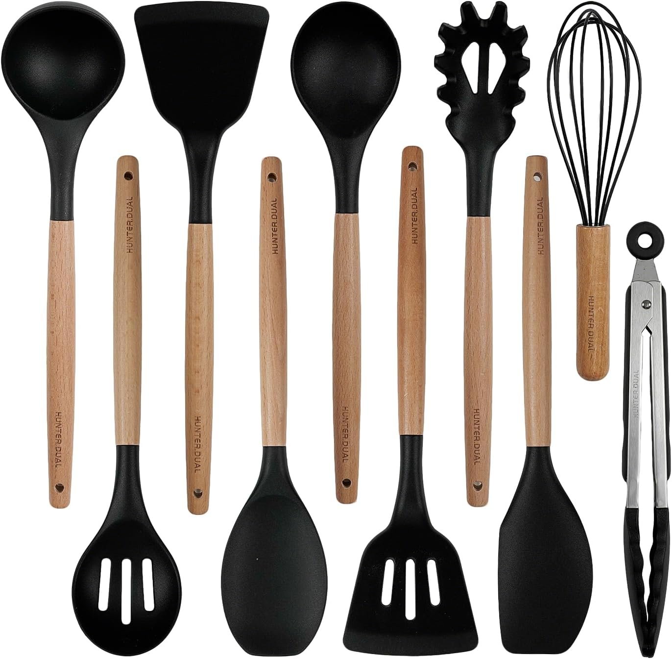 - 10-Piece Set: Includes the 10 most essential cooking utensils: silicone spatula, round spatula, solid spatula, slotted spatula, slotted spoon, solid spoon, soup spoon, pasta spoon, tongs, and egg whisk.