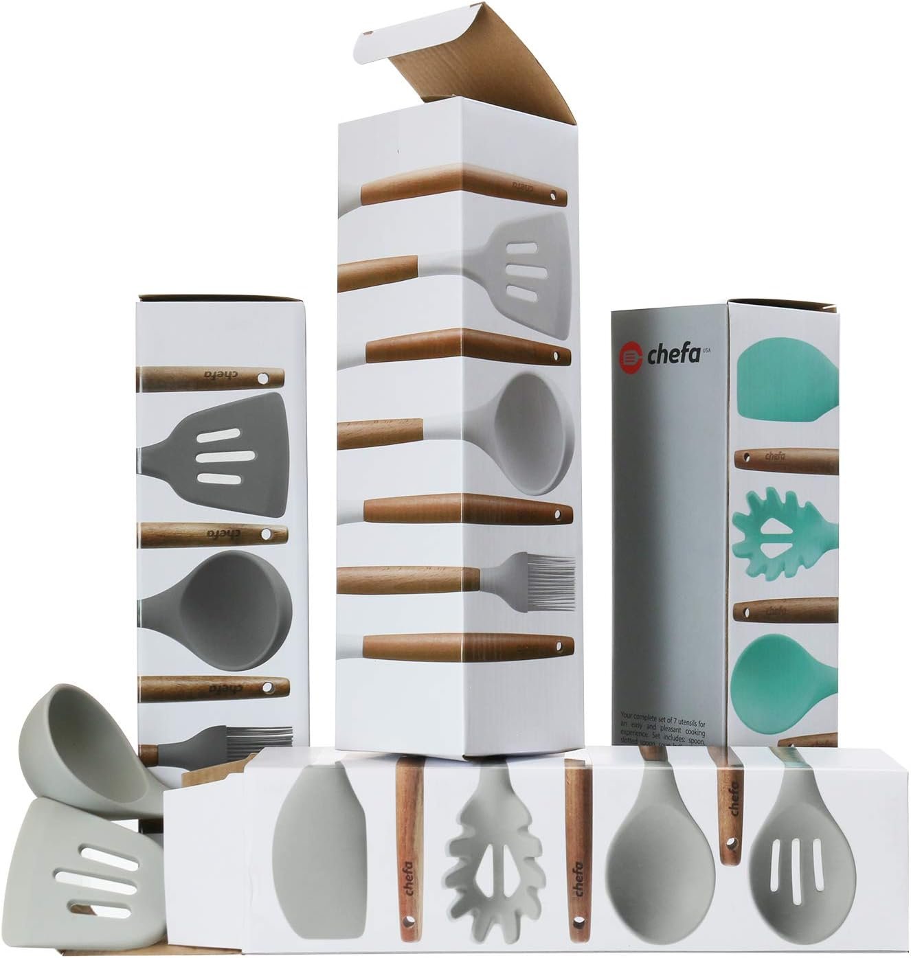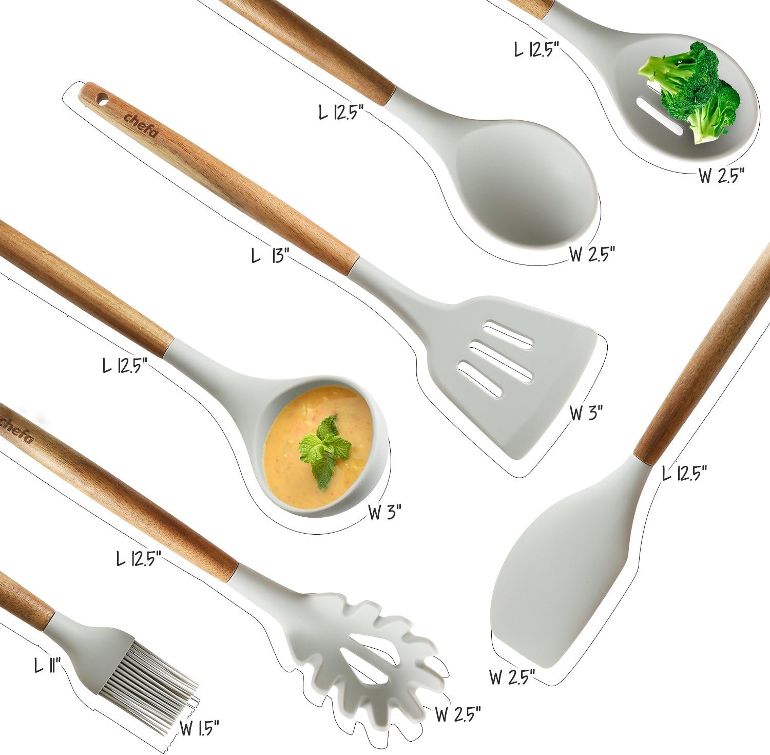 - Elegant and natural design with cool grey silicone heads and natural acacia wooden handles that enhance your kitchen’s decor