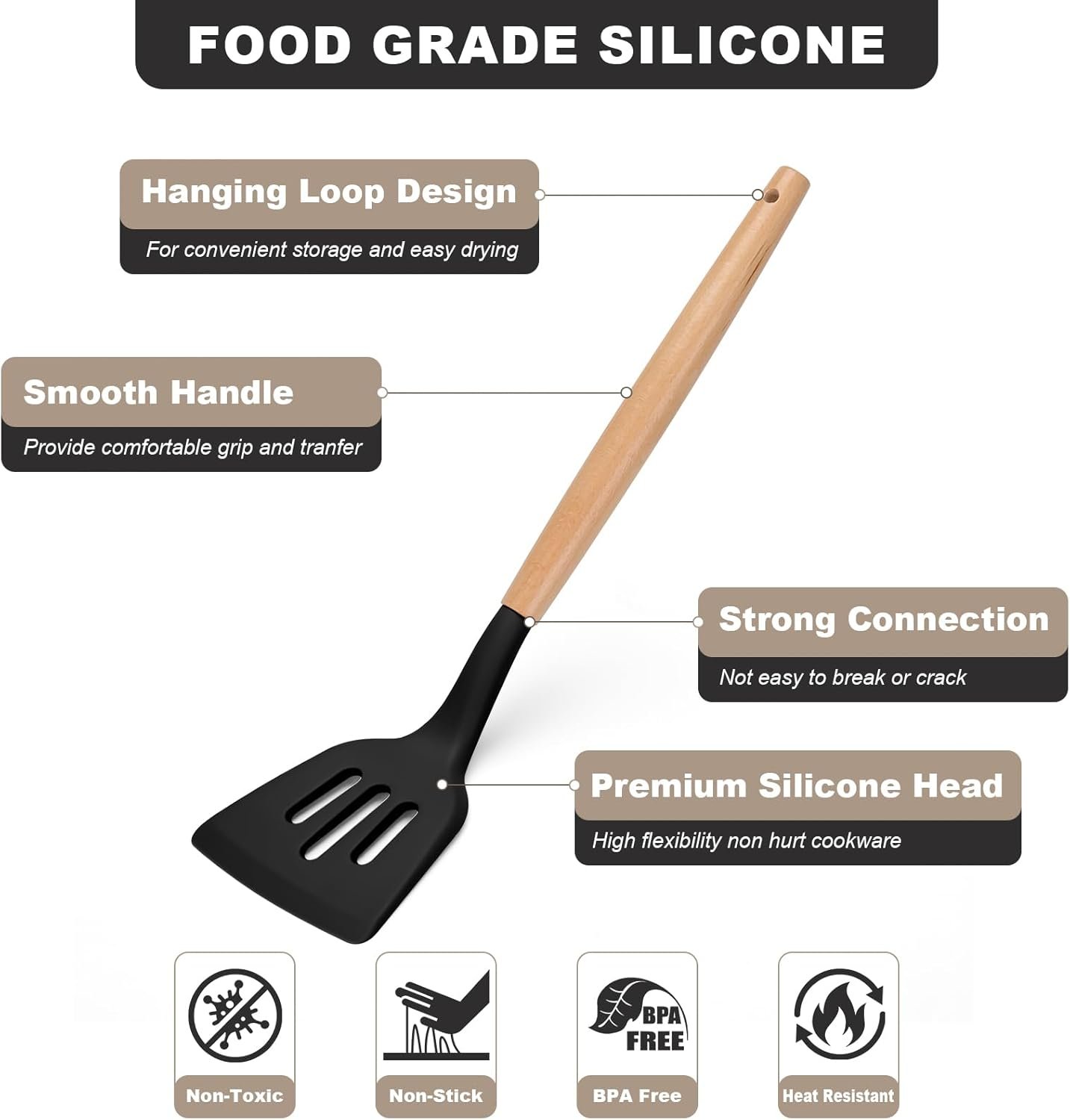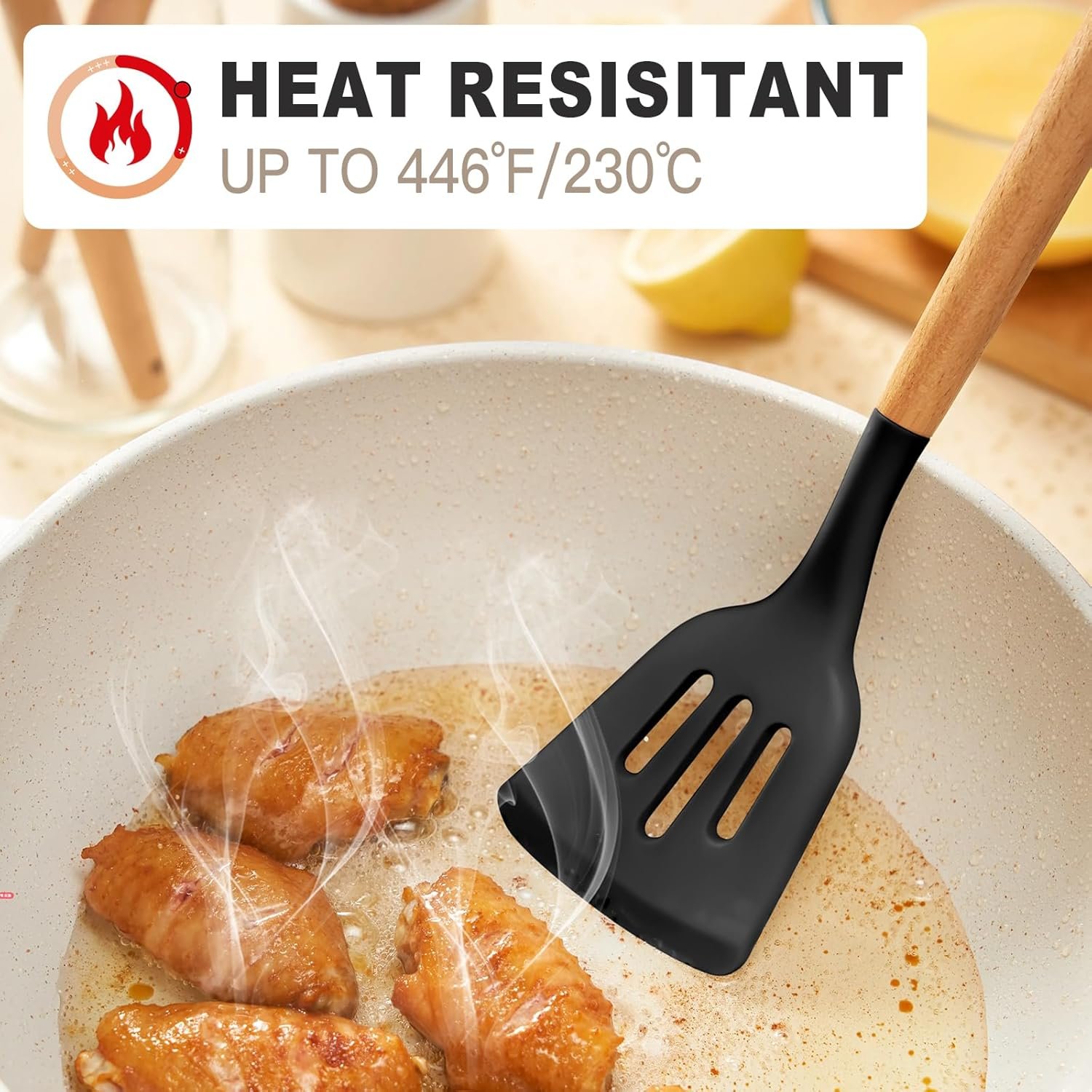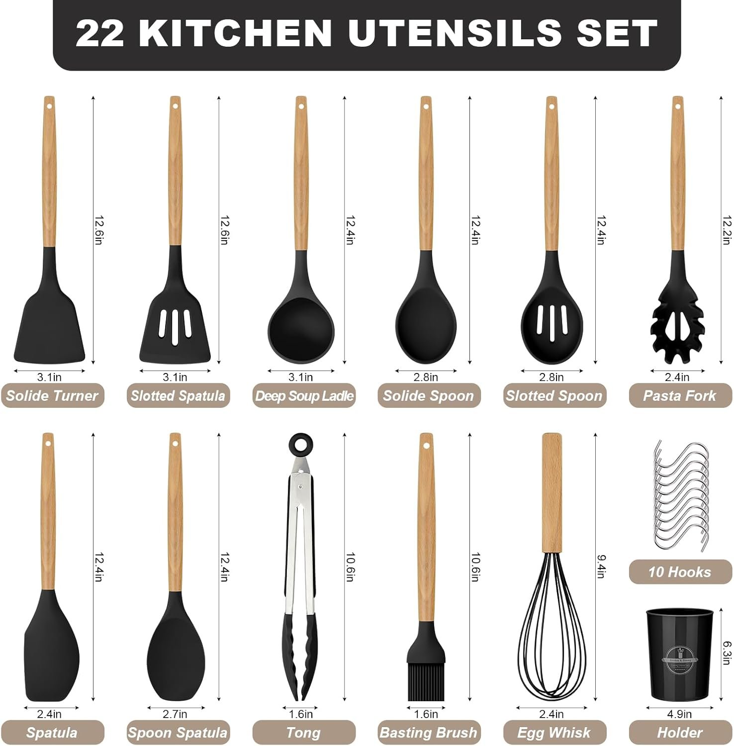 The 22-piece kitchen utensil set is designed to meet your various kitchen needs. The set includes a range of tools, each made with high-quality silicone and durable, eco-friendly wooden handles. The silicone head protects your pots and pans from scratches and dents, while the wooden handle provides a comfortable grip and easy storage options. The set is heat-resistant up to 446°F/230°C, making it perfect for mixing, cooking, and serving hot foods. The non-stick and non-scratch properties make cleaning easy and protect your cookware from damage.