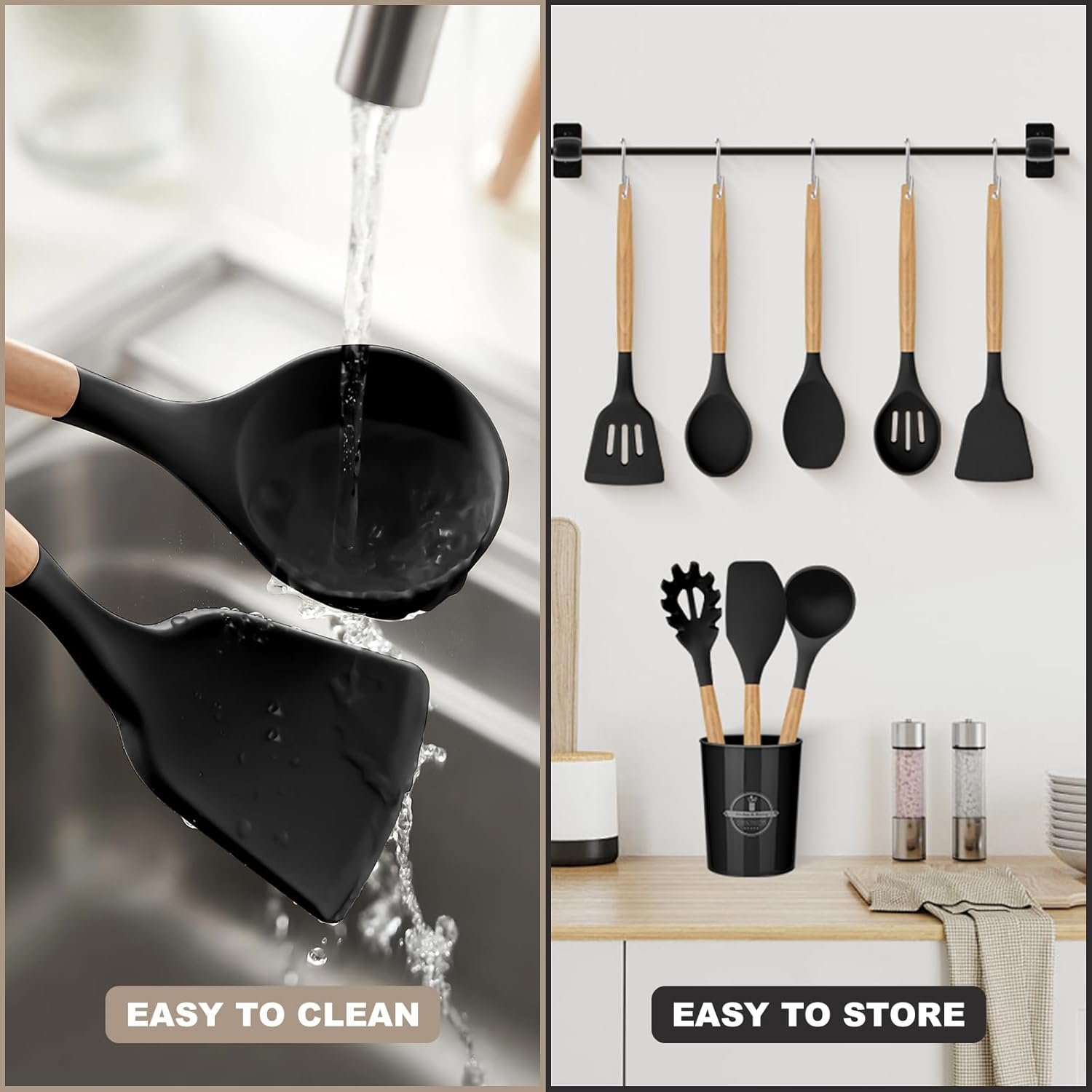 The set includes a matching utensil holder and 10 hanging hooks, providing convenient storage options and keeping your kitchen neat and tidy. The holder provides a central location for your utensils, making them easy to access while cooking, and the hanging hooks allow you to utilize vertical space efficiently, keeping your countertops clutter-free and your tools within reach.
