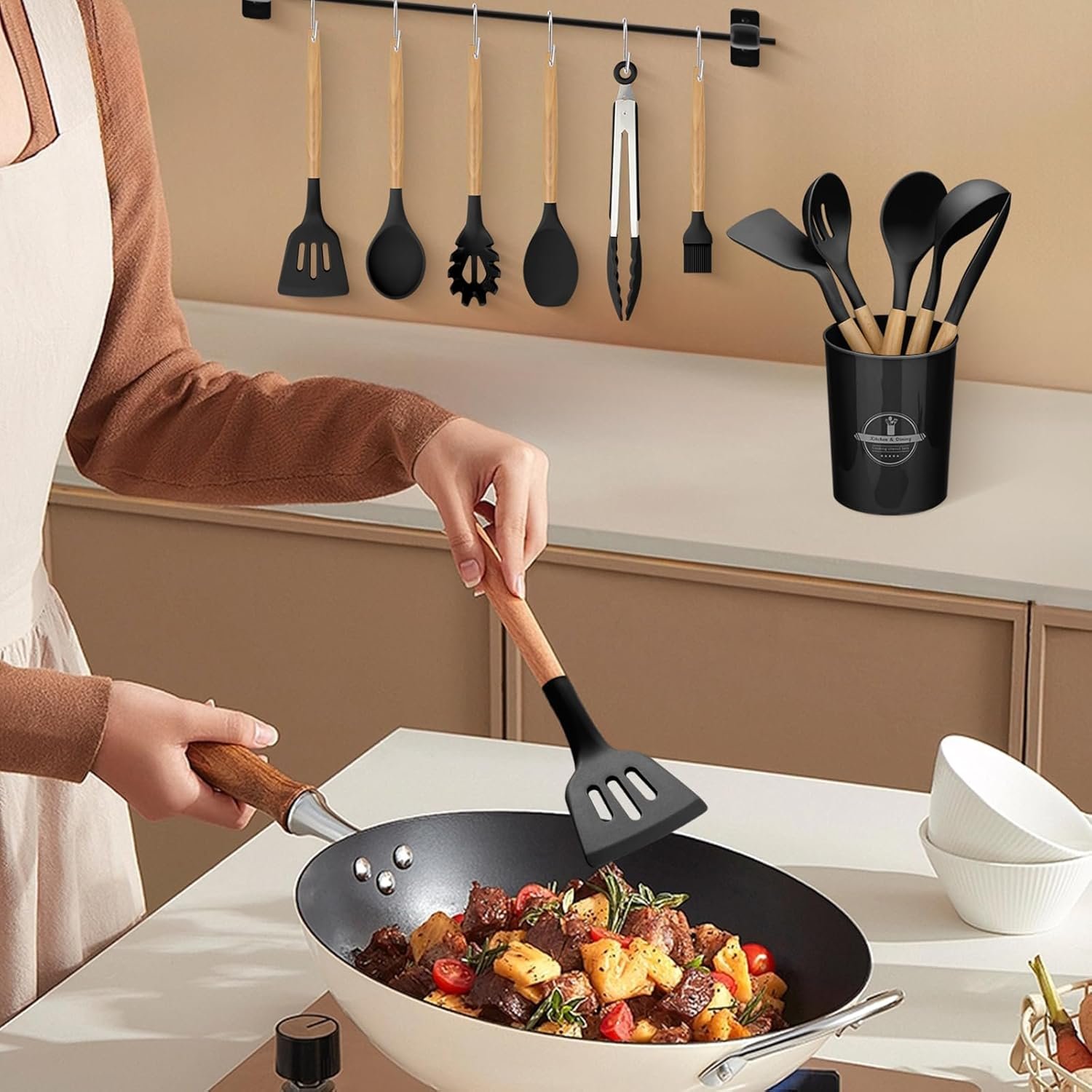 This comprehensive set includes all the essential kitchen tools you need for daily use, making it perfect for mixing, cooking, baking, and serving most foods. The set includes a solid turner, solid spoon, deep soup ladle, slotted spatula, slotted spoon, basting brush, egg whisk, tong, spatula, pasta fork, spoon spatula, holder, and 10 hanging hooks.