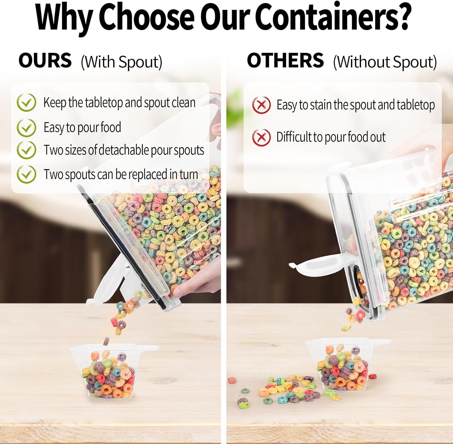 These cereal containers storage dispensers are 100% airtight and leakproof. The four-sided locking lid ensures food freshness and prolongs storage time. We add a silicon seal around the lid and the spout to prevent air and moisture from entering, creating double sealing that ensures food freshness, leakproof, and dustproof.