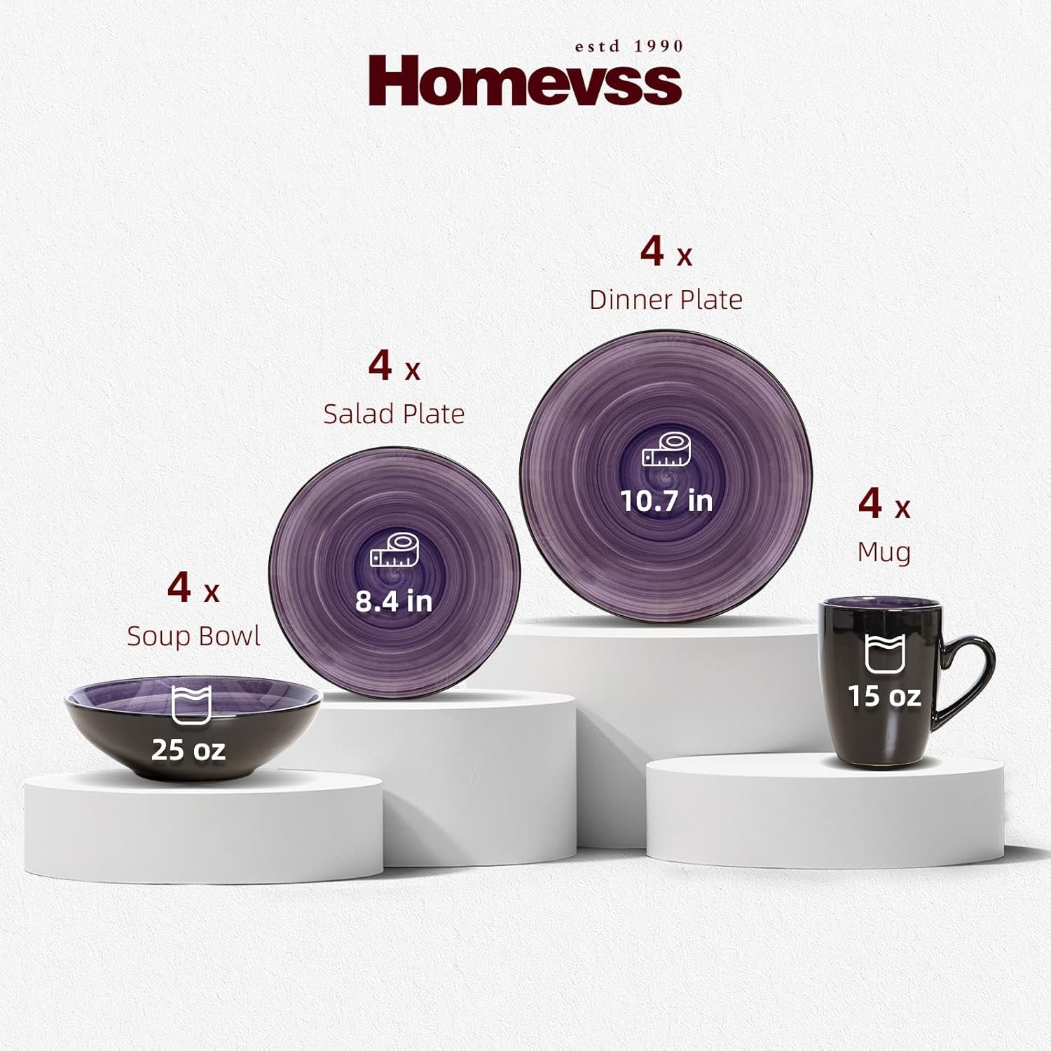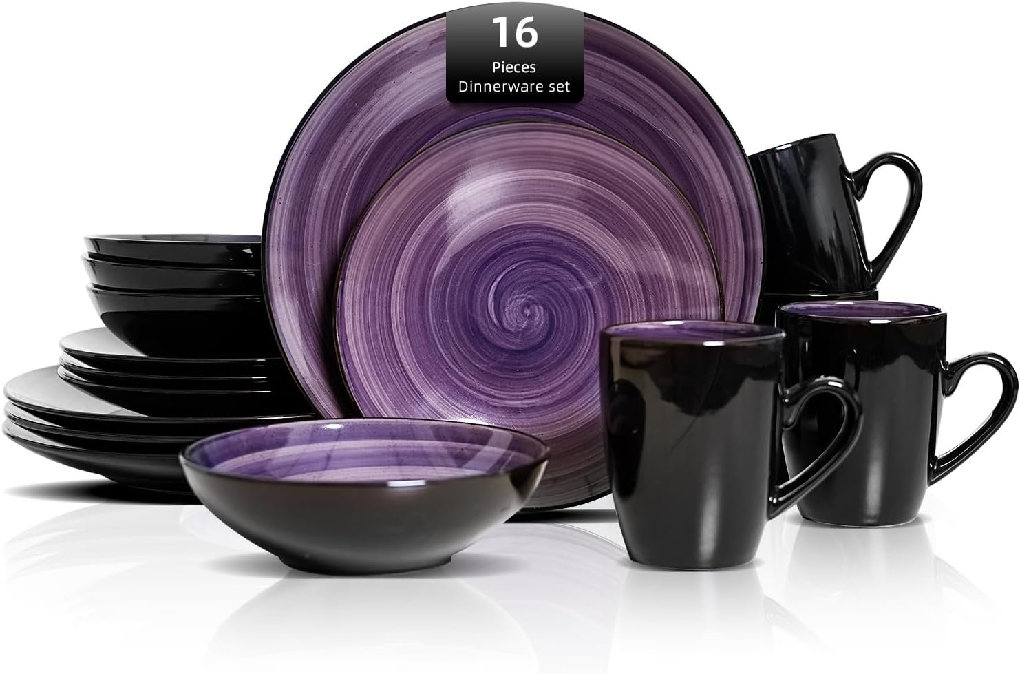 - Service for 4: 16pc Dinnerware Set including 4 of Each Dinner Plate 10.5″, Salad Plate 8″, Soup/Pasta Bowl 7″, Mug 13oz