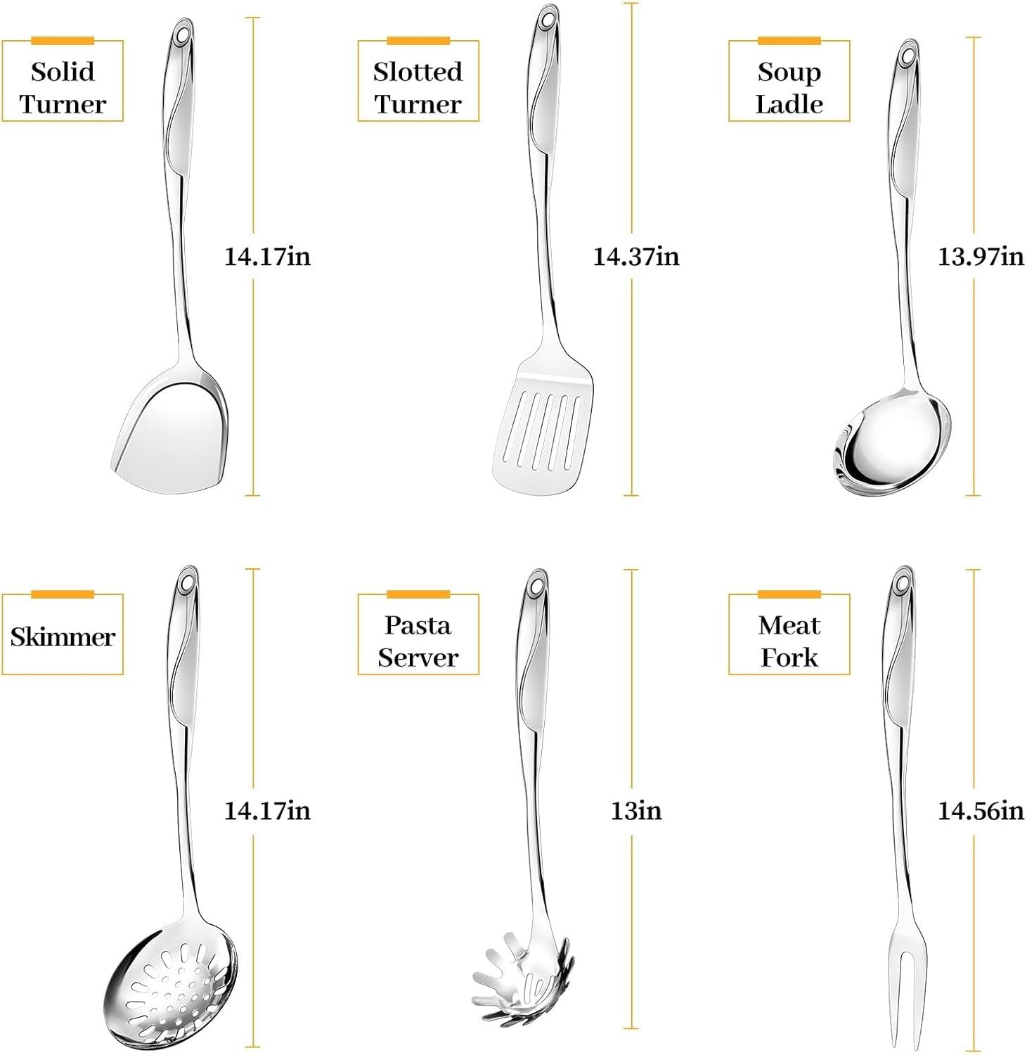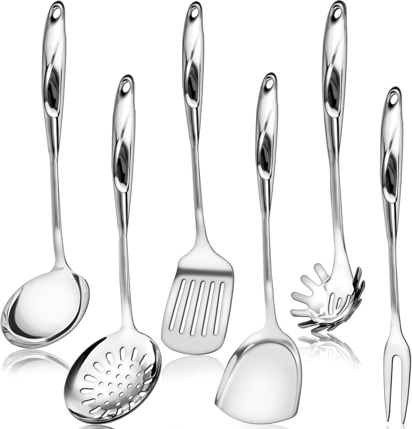 This 6-piece stainless steel utensils set is designed to make cooking easier and more efficient. The set includes a ladle, slotted spoon, solid turner, slotted turner, spaghetti spoon, and meat fork, all crafted from high-quality stainless steel that resists bending and deforming.
