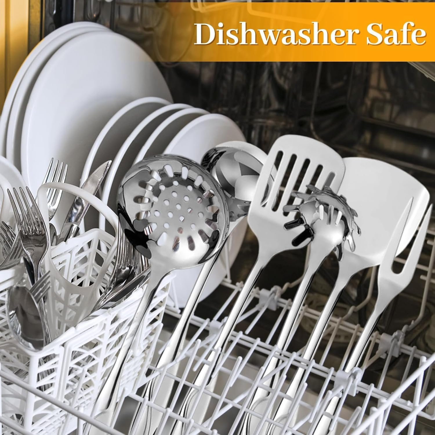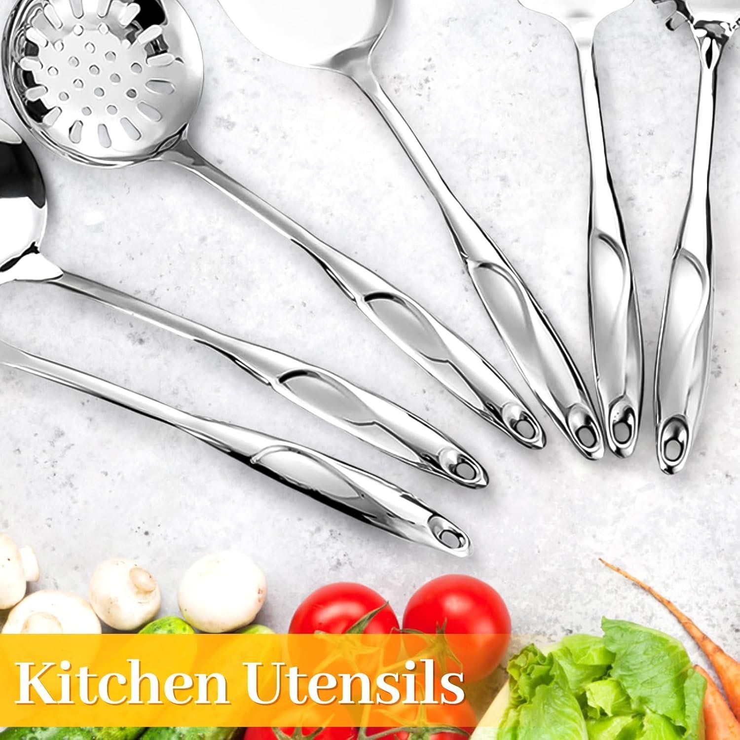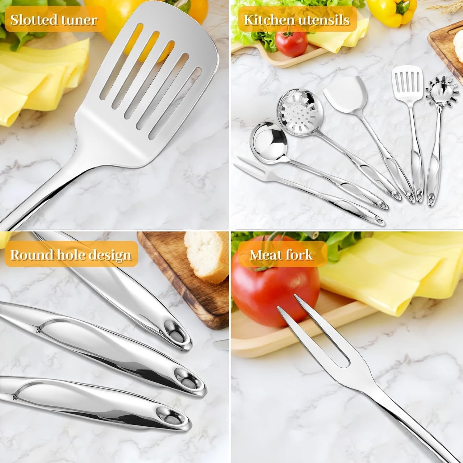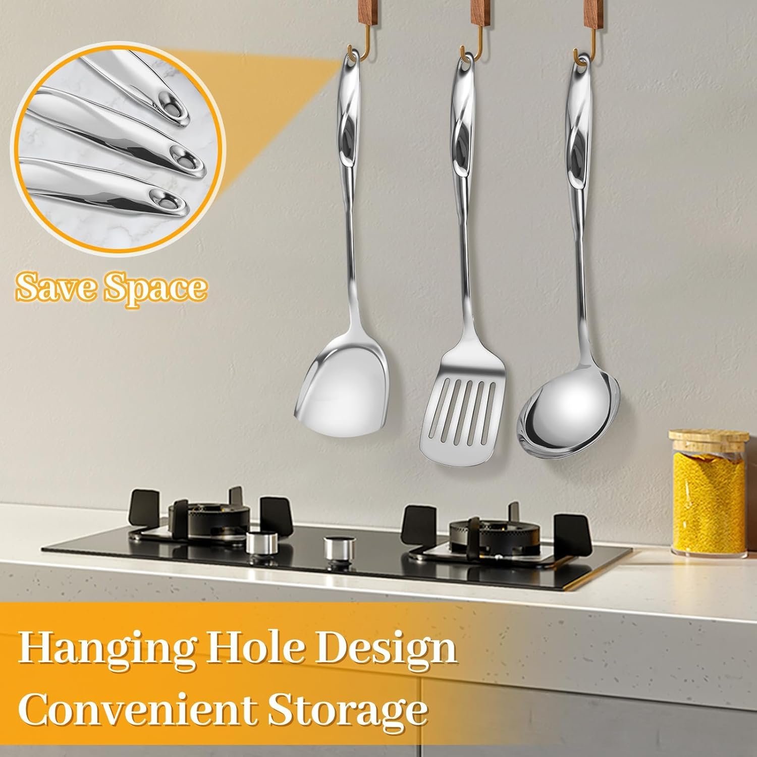 The set also features convenient hanging holes, making storage simple. You can tuck the stainless steel utensils neatly into a storage bucket or hang them directly on your wall for instant access. The mirror-polished surface protects your pots, pans, and hands from scratches and resists stains, making post-meal cleanup much easier.