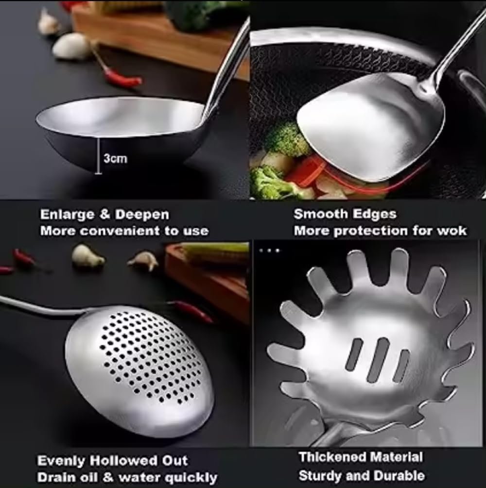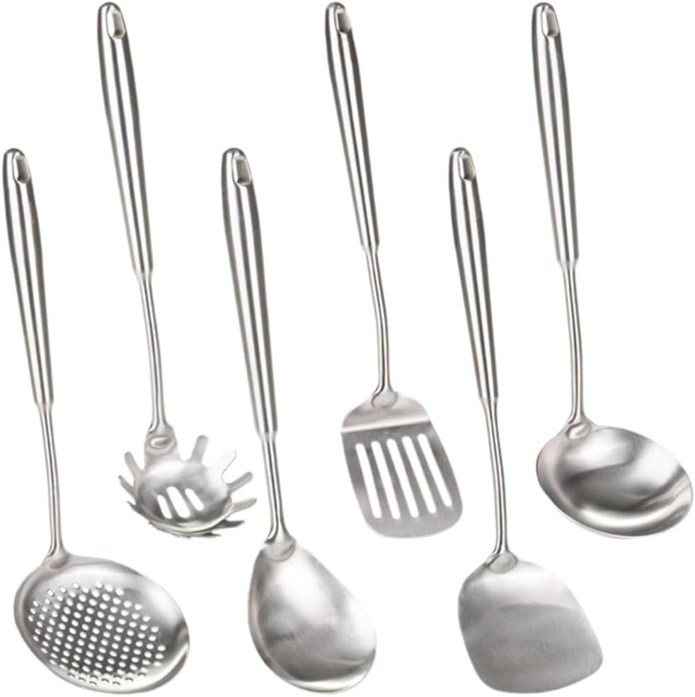 This 6-piece cooking utensils set is made of high-quality 304 stainless steel, ensuring durability and resistance to rust and corrosion. The set includes a wok spatula, ladle, skimmer, slotted spatula, spaghetti spoon, and large spoon, providing all the necessary tools for cooking and serving.