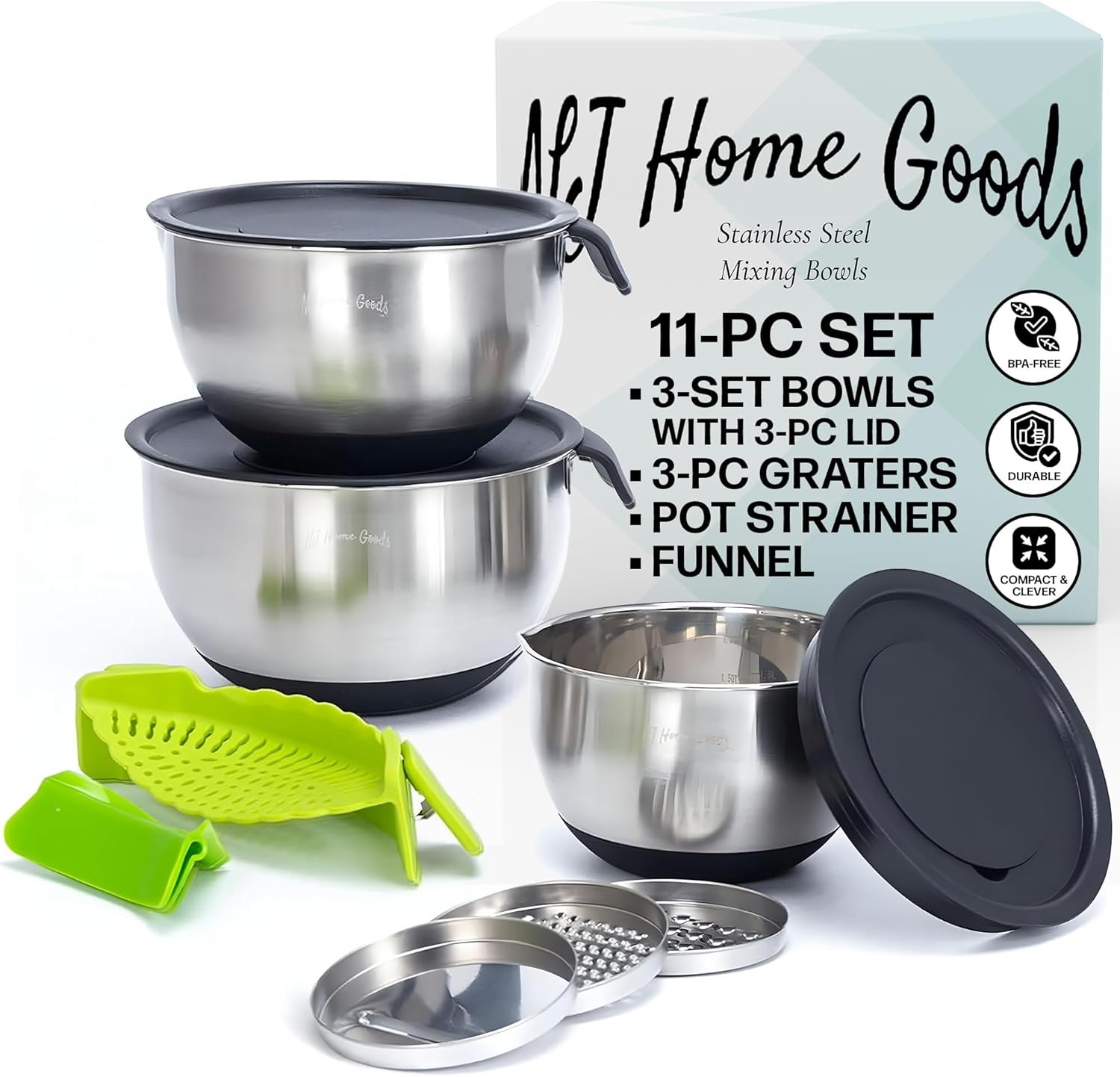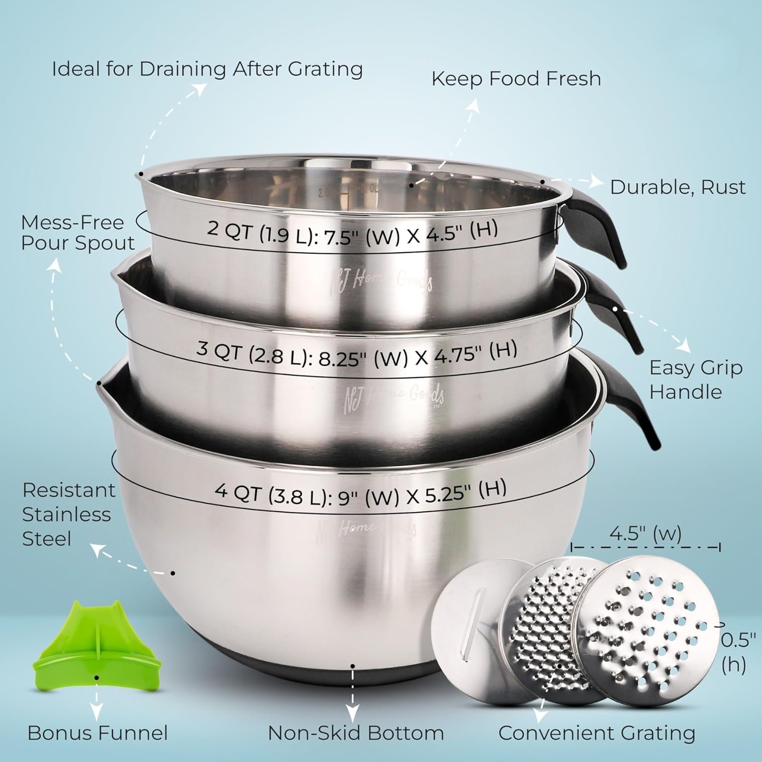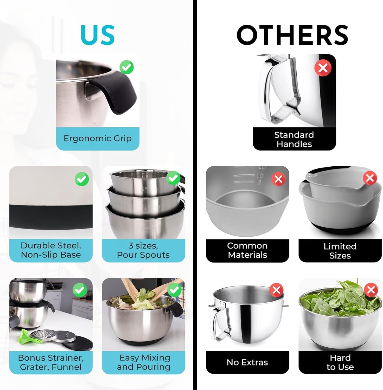 Enhance your kitchen with our set of three nesting bowls. Made of quality stainless steel, these bowls will meet all your cooking needs, from mixing to serving.