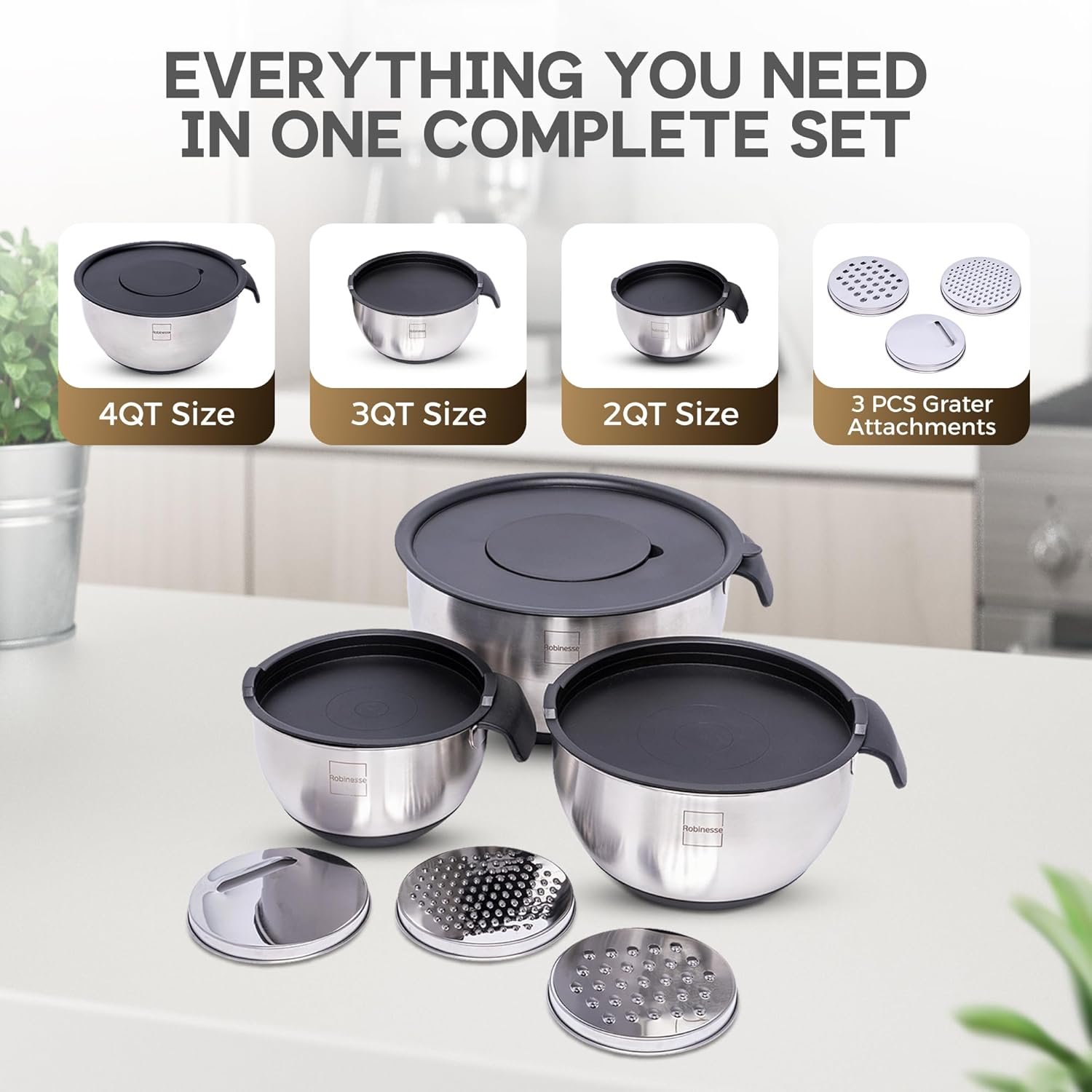 These stainless steel mixing bowls are perfect for any kitchen task, from mixing and serving to storing food. The airtight lids and grater attachments make meal prep and cooking easier and more efficient. The dishwasher safe design and lightweight construction make cleaning and handling a breeze. Whether you’re a professional chef or a home cook, these bowls are a great addition to your kitchen arsenal.