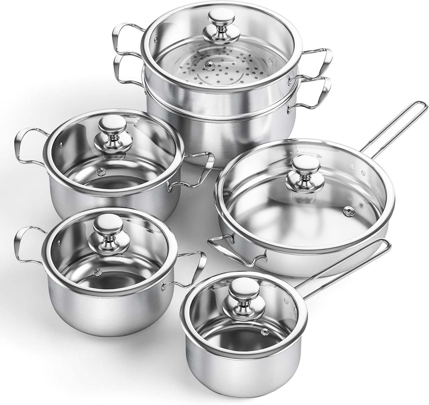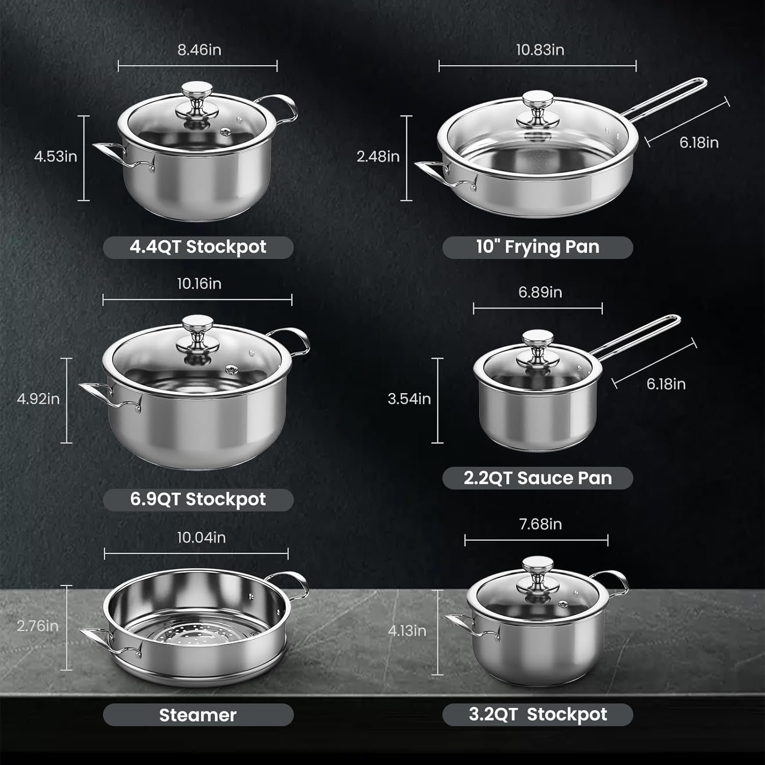 - Versatile Pots and Pans: 11-piece set includes 2.2QT Sauce Pan, 3.2QT Stockpot, 4.4QT Stockpot, 6.9QT Stockpot, 10″ Frying Pan and Steamer