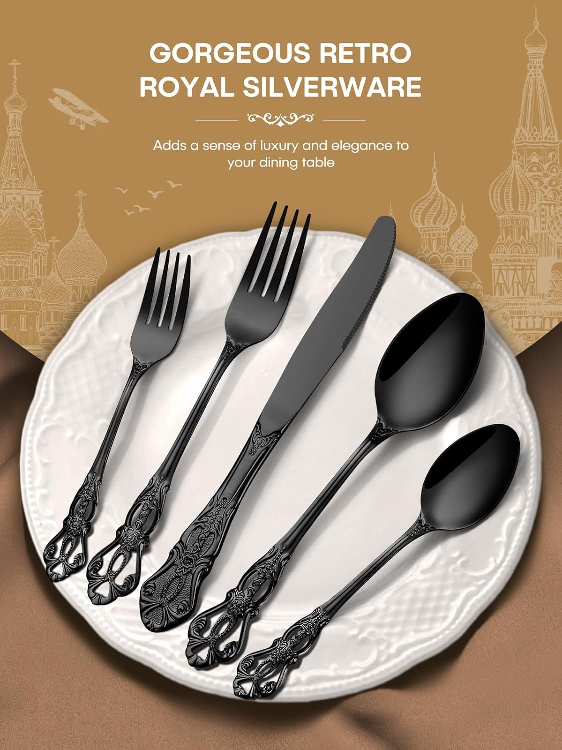 Our black silverware is made of food-grade high-quality stainless steel, providing the longest-term value and the best properties, it offers nice resistance to rust and corrosion to get the most sturdy and healthy experience while using, never bends or chips in daily use. Easy to clean, and also dishwasher safe. This chic set would be the best purchase for all purposes, your guests, friends, or family will love this beautiful set, and you will get many compliments.
