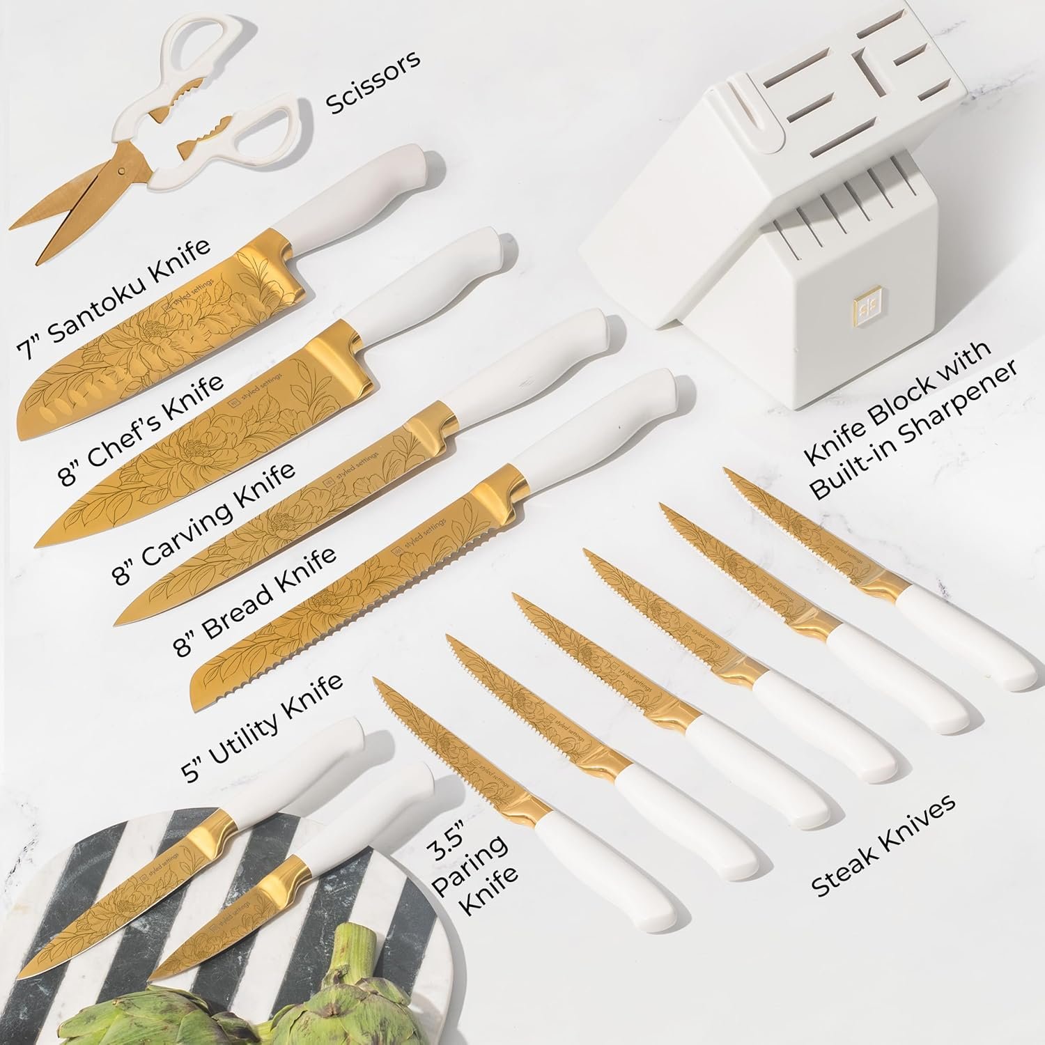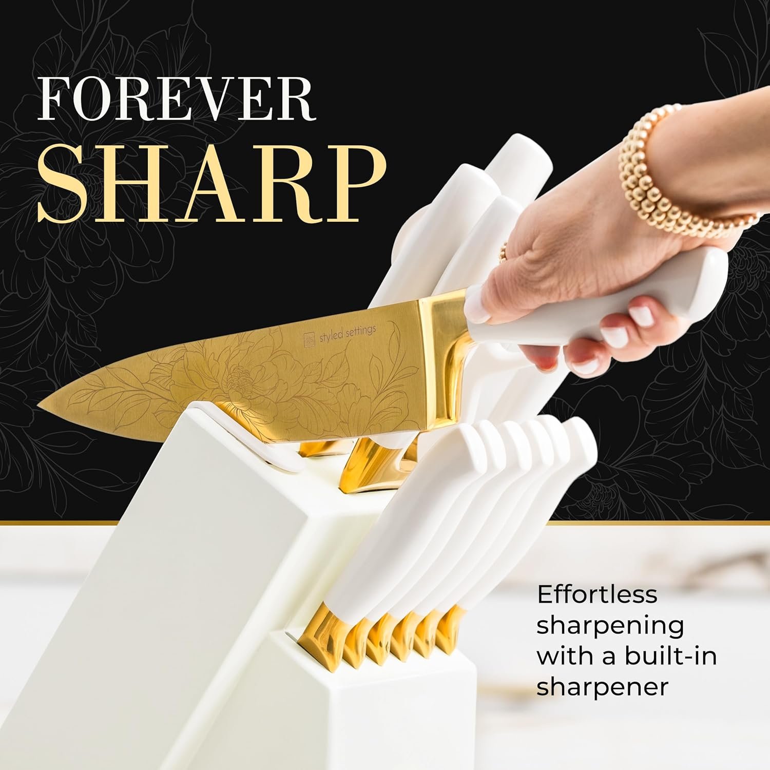 This 14-piece knife set is designed to make a statement in your kitchen. With its sleek white and gold design, floral pattern, and built-in sharpener, it’s the perfect combination of style and functionality. The set includes a chef’s knife, carving knife, santoku, bread knife, utility knife, paring knife, six steak knives, and heavy-duty kitchen shears, all housed in a knife block with a built-in sharpener.