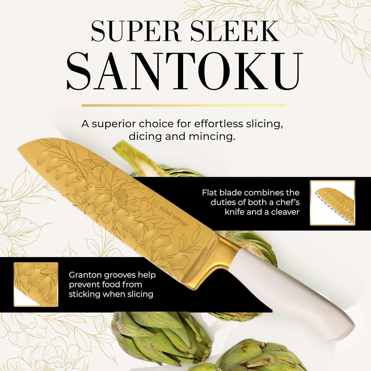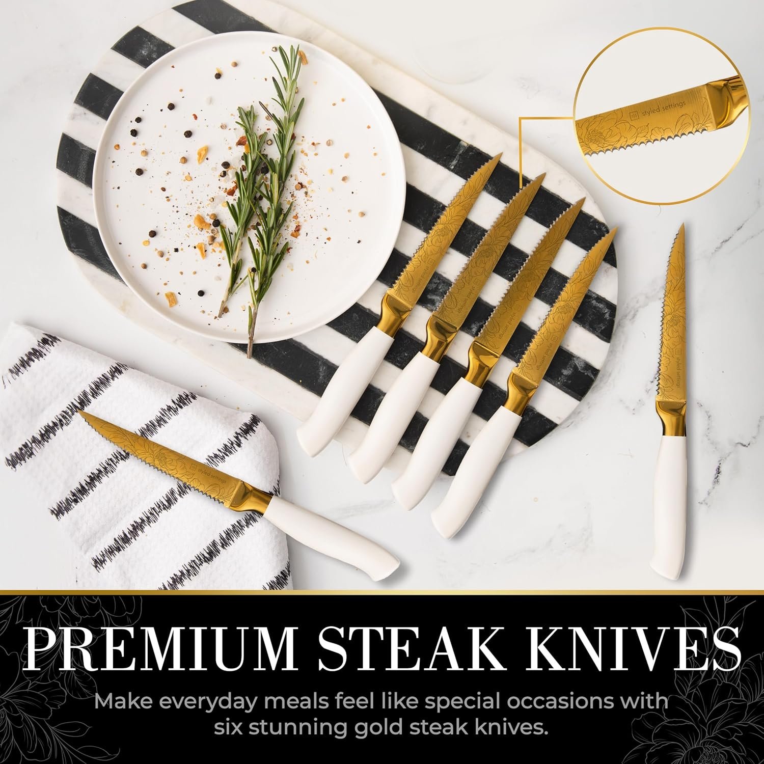 The set is also perfect for gift-giving, with its elegant design and premium materials making it a thoughtful and impressive present. Pair it with gold kitchen utensils or a gold cooking utensils set for a complete luxe look. With its exceptional performance, stunning design, and convenient features, this white gold knife set is a must-have for any kitchen.