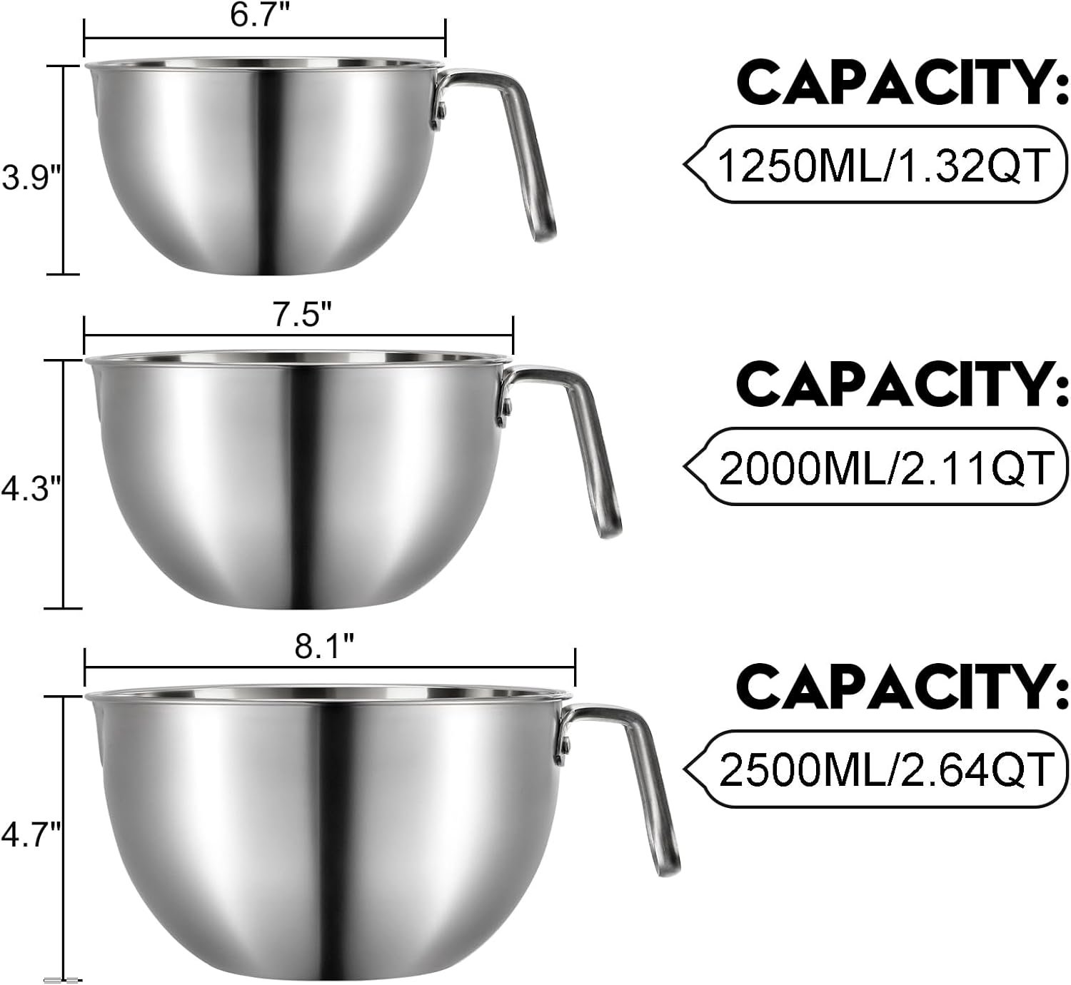 Our mixing bowls come in 3 different sizes (1.3QT, 2.1QT, 2.6QT) to satisfy your demands for mixing large batters, tossing salads, melting chocolate/wax/candy, marinating, and storing. They are great gifts for family, friends, and loved ones for birthday, housewarming, Christmas, Thanksgiving, and special occasions.