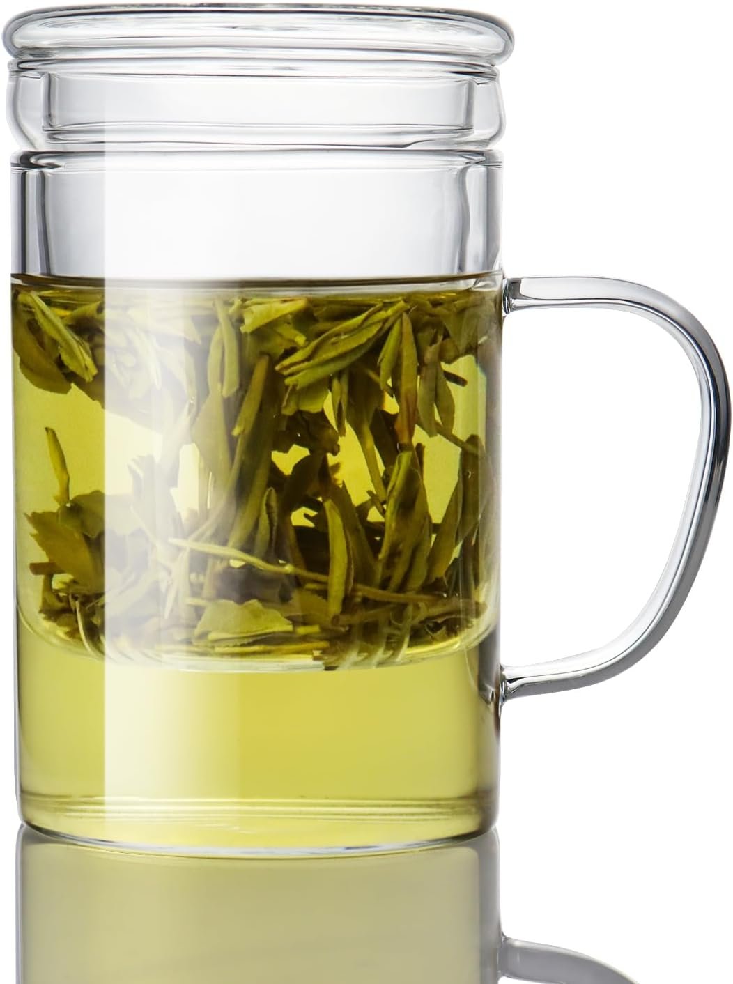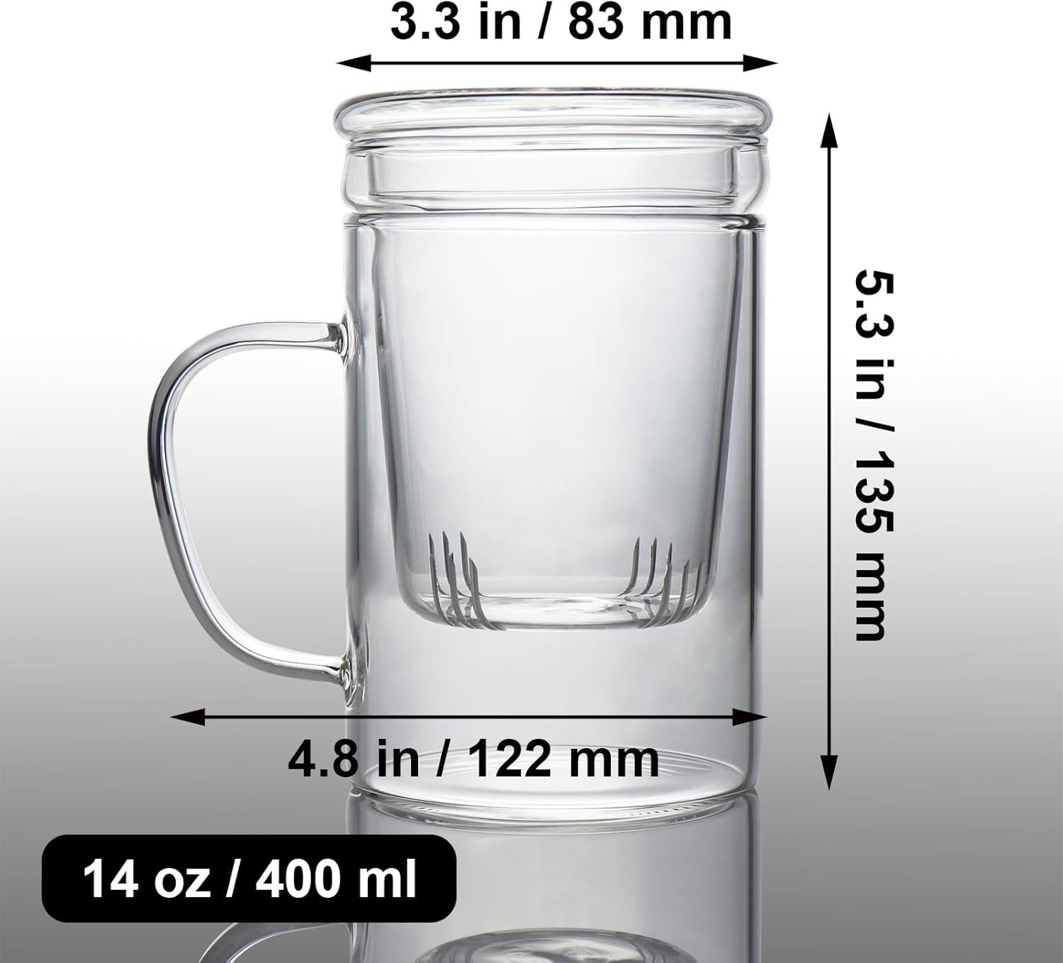 The 14 fl oz (400 ml) glass tea mug is designed to provide a perfect personal tea experience. It comes with a large glass infuser and lid, making it ideal for enjoying loose-leaf teas with ease.