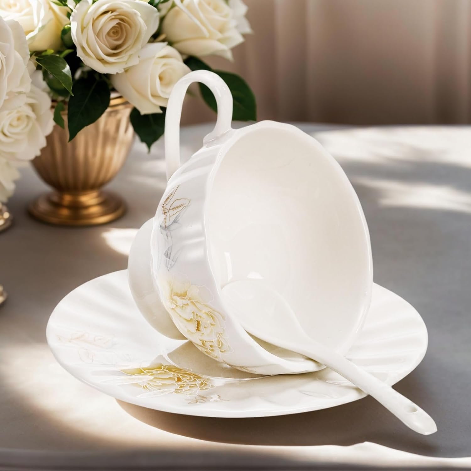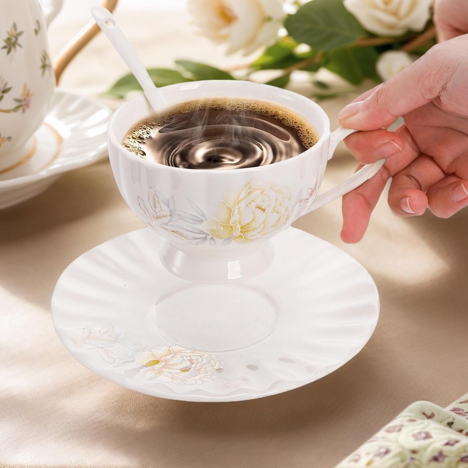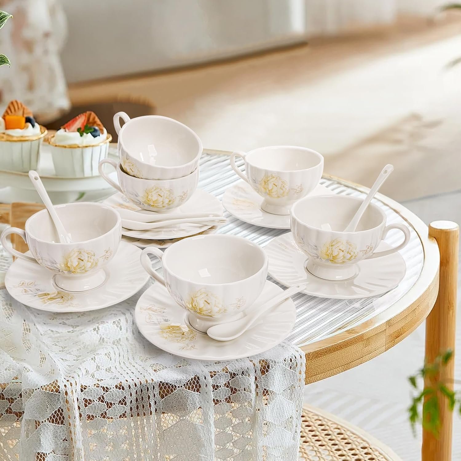 This tea cup saucer set is a super value set that includes 6 cups of 7oz, 6 saucers, and 6 spoons. It’s perfect for hosting guests or daily family use. The set is made of fine porcelain, which is sturdy and built to last. It’s microwave-safe, allowing you to warm up your tea or coffee effortlessly, and dishwasher safe for added convenience.