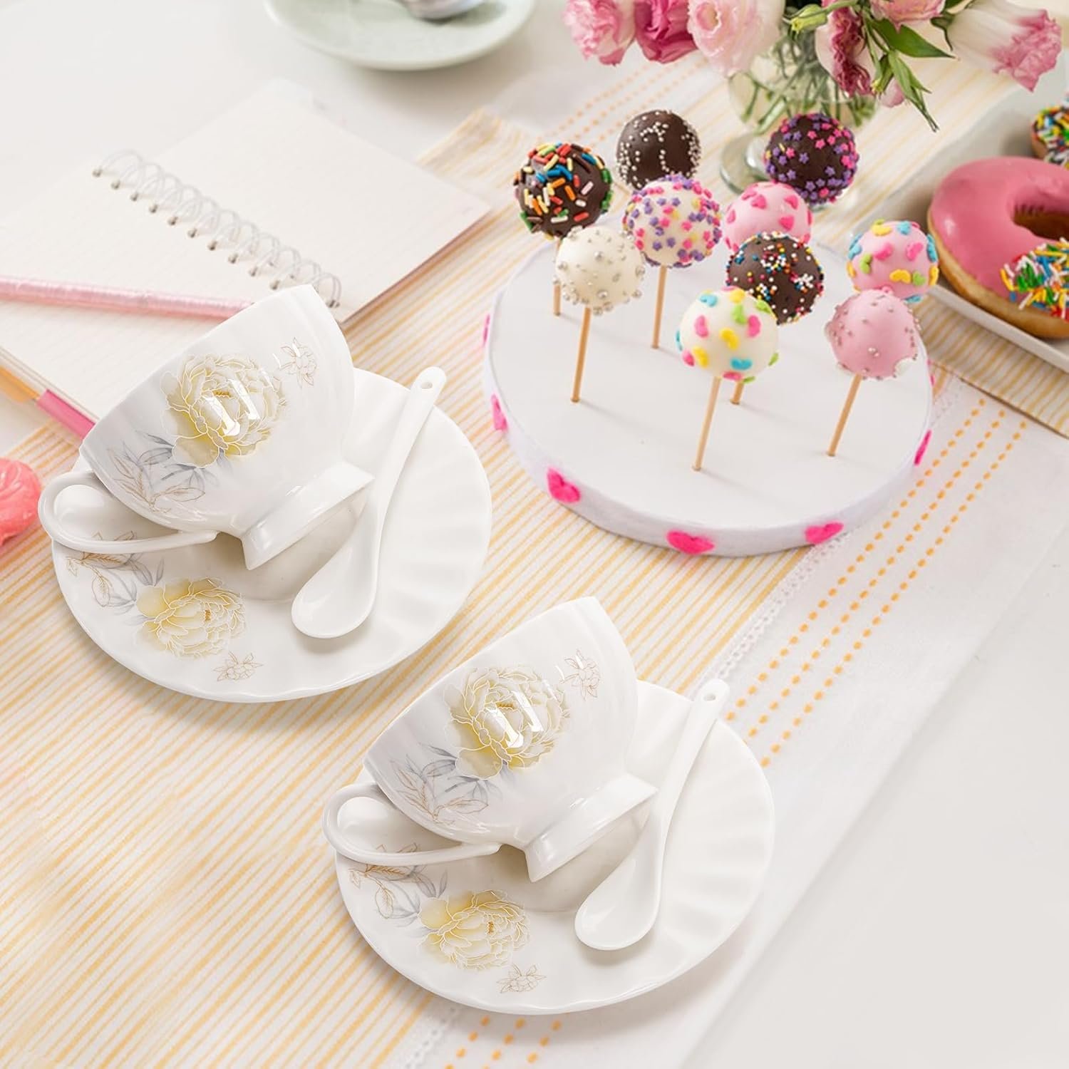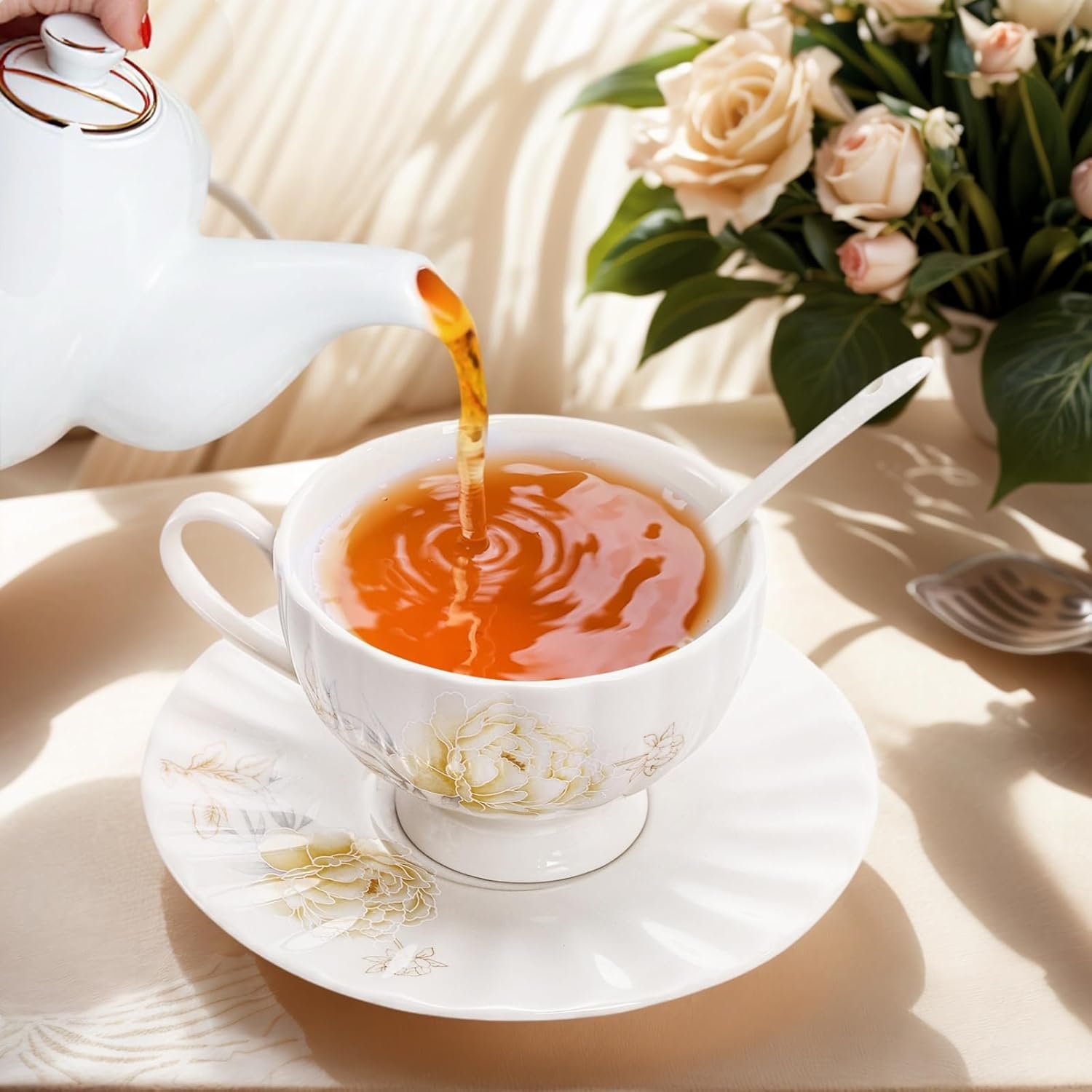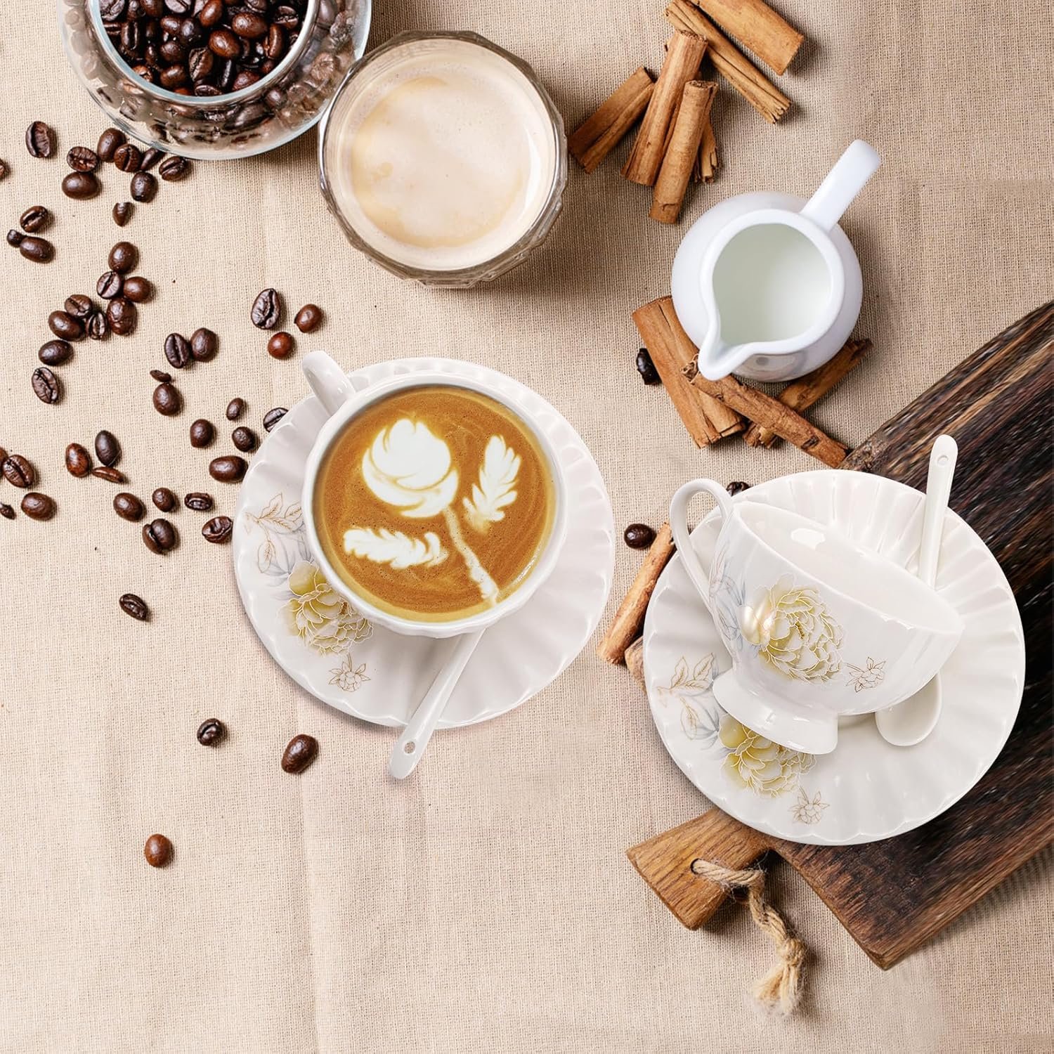 This tea cup saucer set is a super value set that includes 6 cups of 7oz, 6 saucers, and 6 spoons. It’s perfect for hosting guests or daily family use. The set is made of fine porcelain, which is sturdy and built to last. It’s microwave-safe, allowing you to warm up your tea or coffee effortlessly, and dishwasher safe for added convenience.