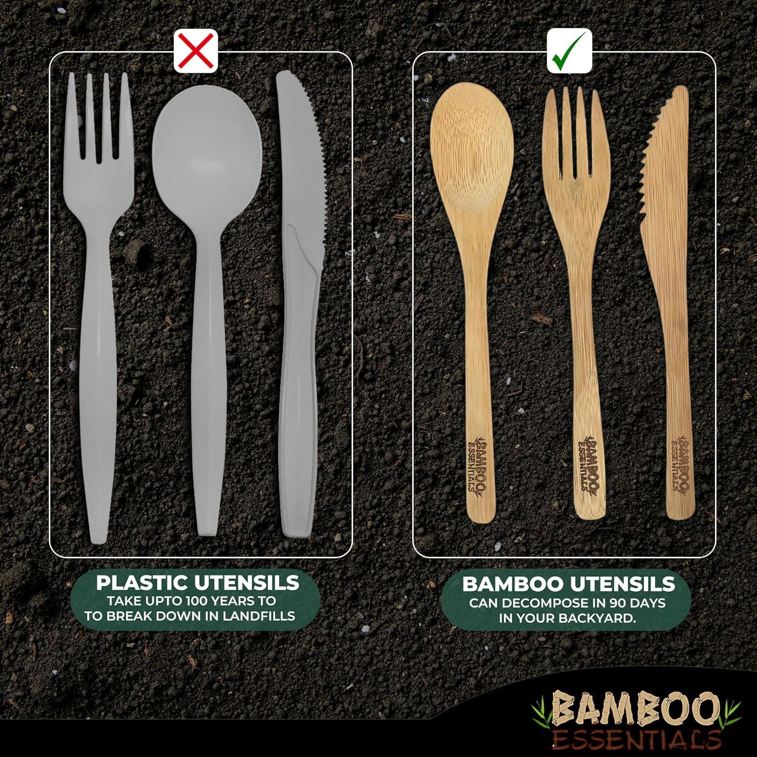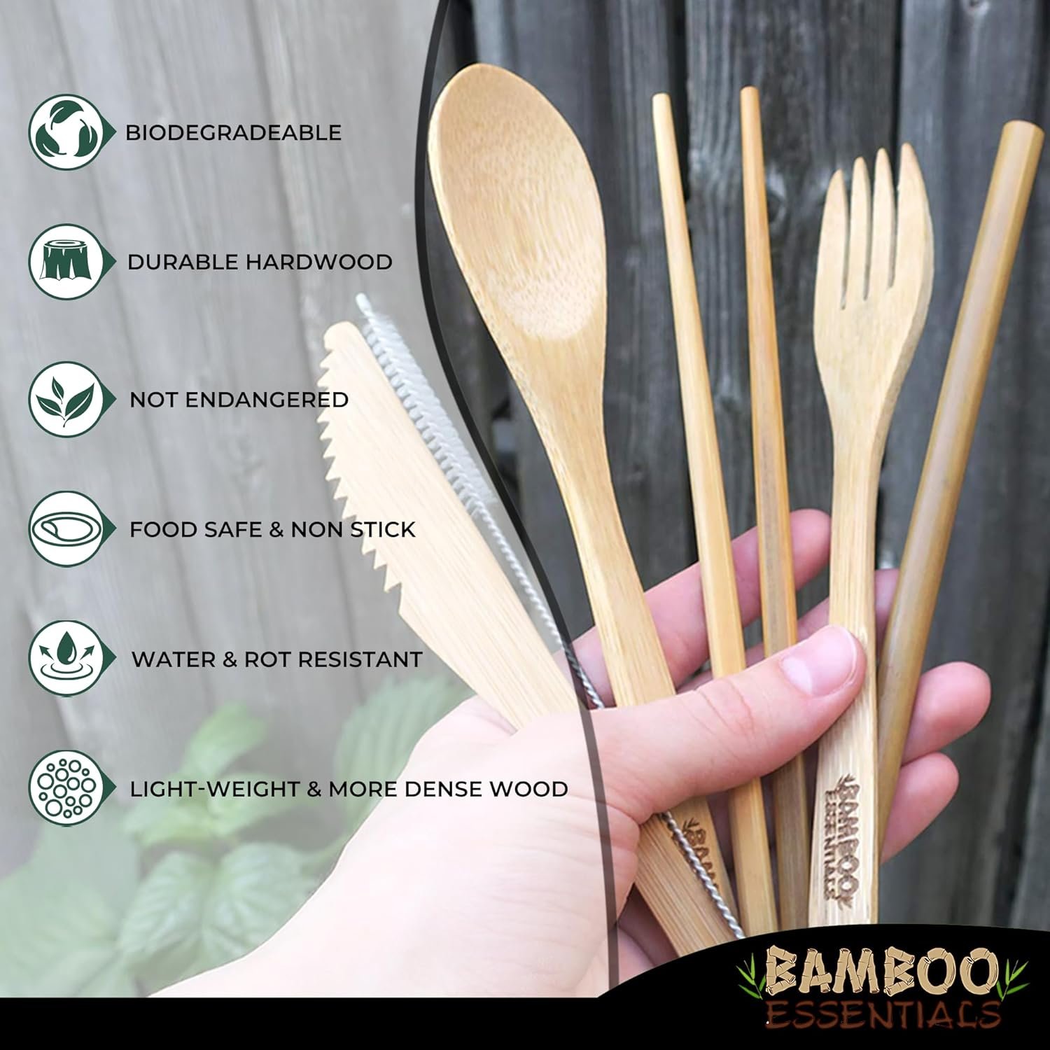 Bamboo Essentials offers a high-quality, eco-friendly bamboo travel utensil set that is perfect for camping, hiking, picnicking, and everyday use. Our utensils are made from natural, vegan, and food-safe materials, ensuring durability and longevity. With our reusable bamboo utensil set, you can help reduce waste and promote sustainability.