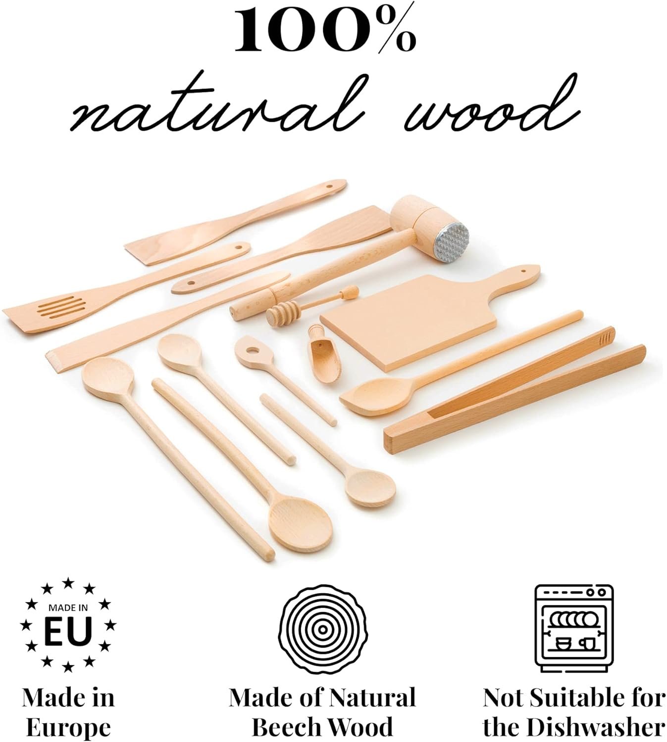 Tuuli Kitchen – 15-Piece Cooking Utensils Set, Specially Designed Solid Beechwood Wooden Spoons, Wood Spatula, Tenderiser and Honey Dipper, Durable Wooden Utensils for Everyday