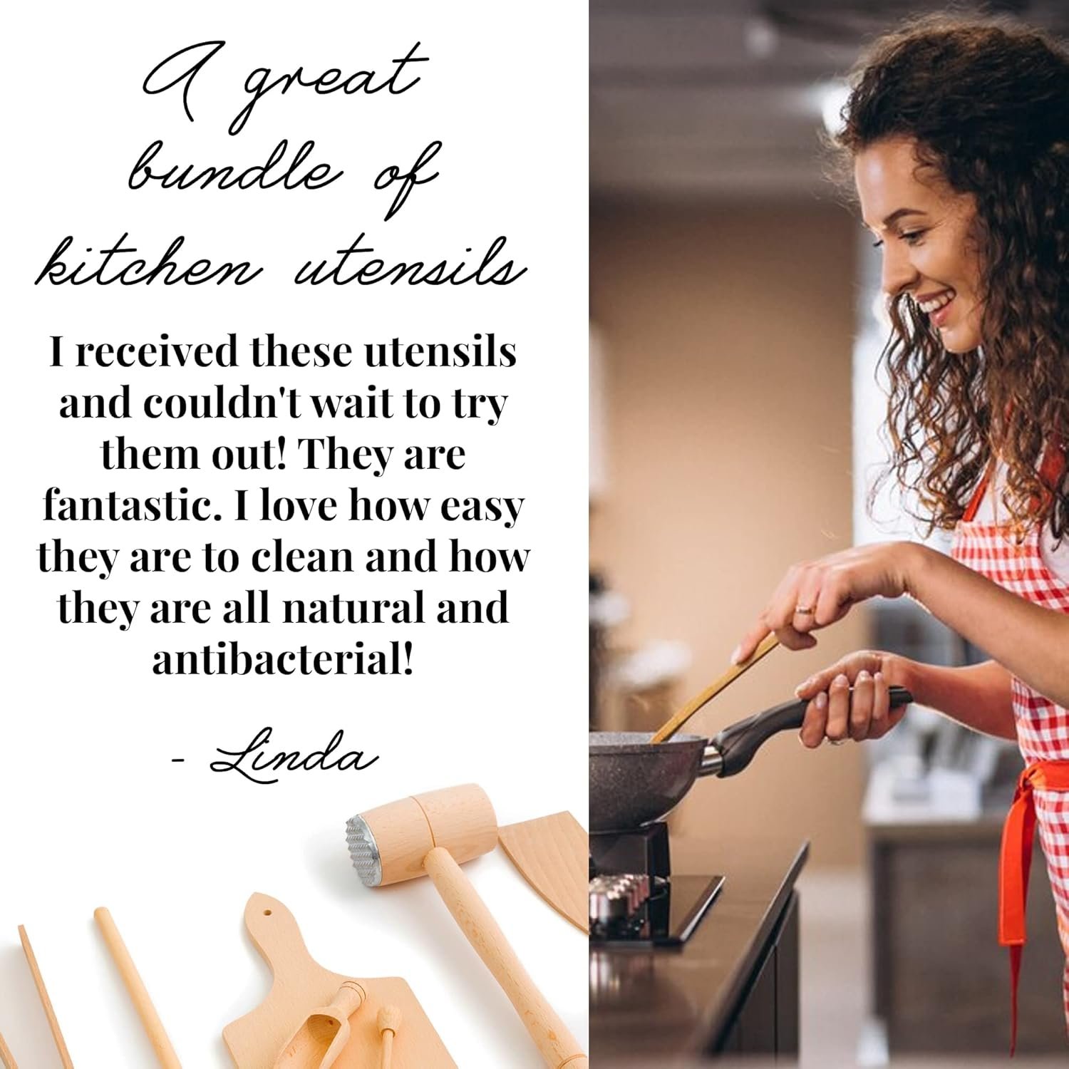 • Lightweight wood kitchen utensils with smooth surfaces