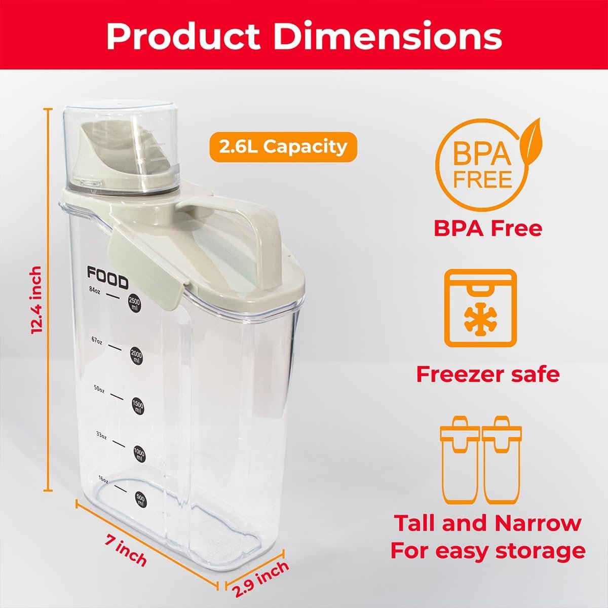 Our product offers a convenient and mess-free way to store and dispense dry goods, making it perfect for cereals, pasta, snacks, pet food, and even laundry detergent. The two-pack set includes two spacious 2.6-liter containers, providing ample space for all your needs.