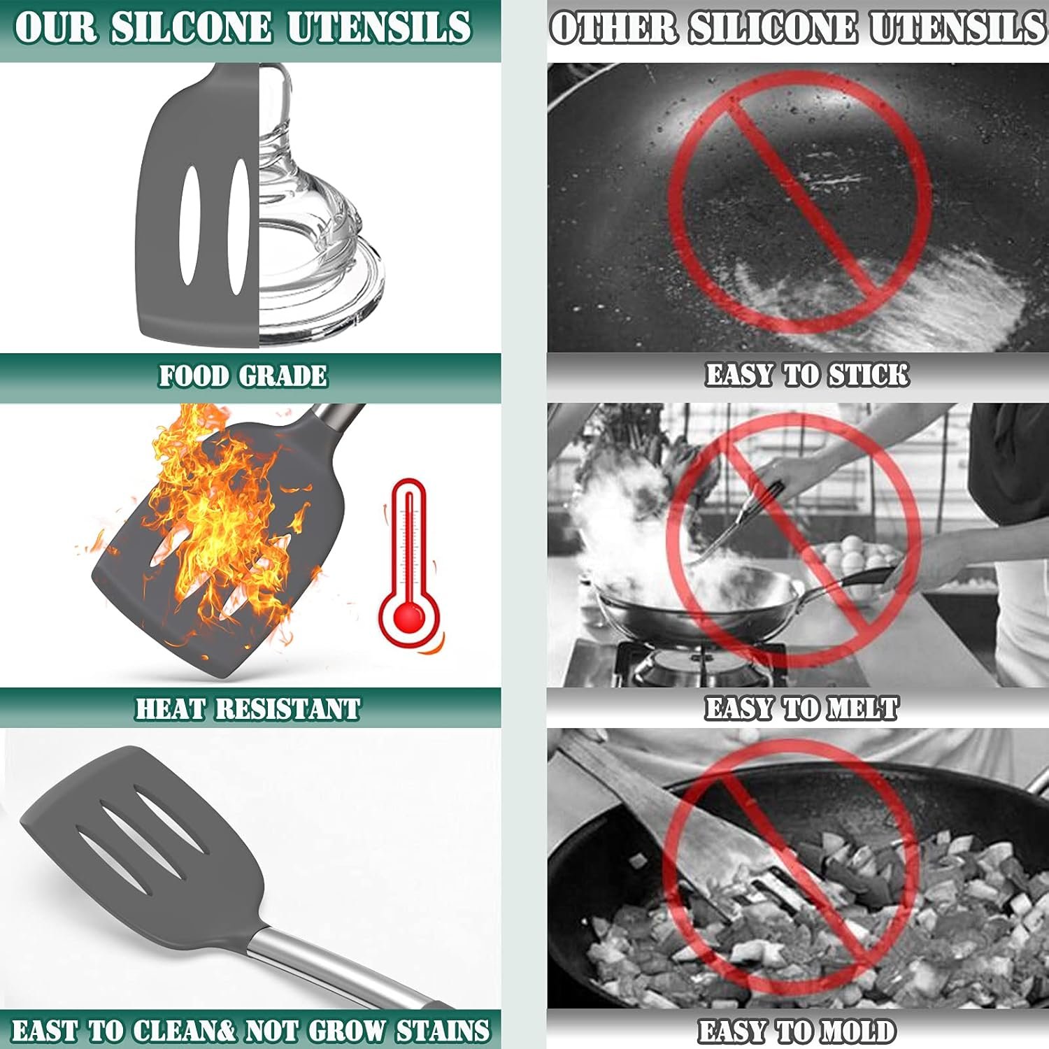 - Heat-Resistant, Non-Melting, Odorless: Our silicone cooking utensils can withstand temperatures up to 446°F, and the stain-resistant silicone head will not leave odors or colors even when used for mixing dark food.
