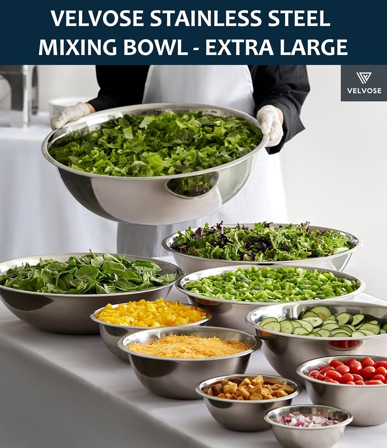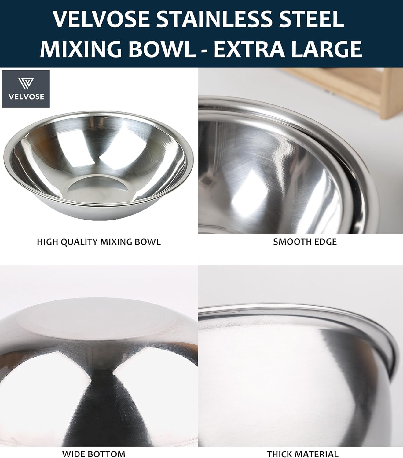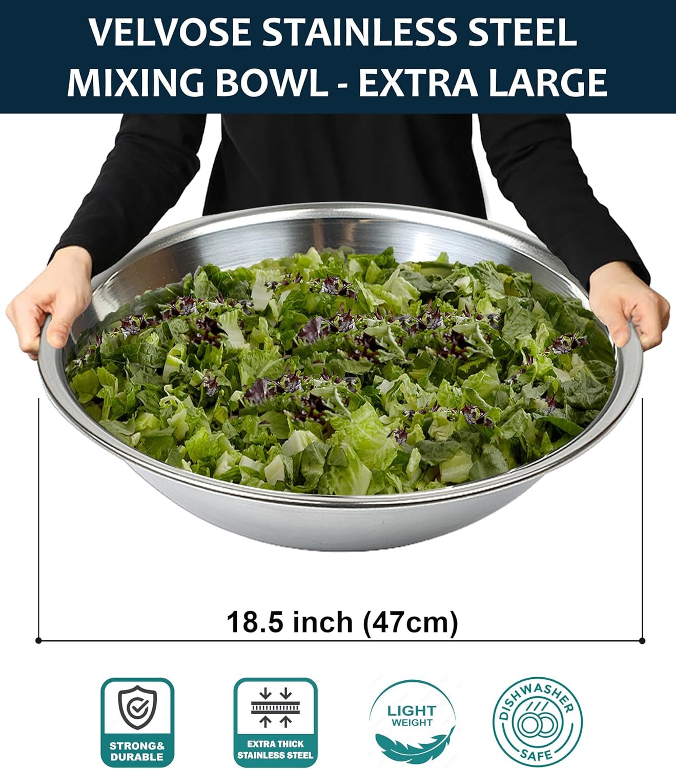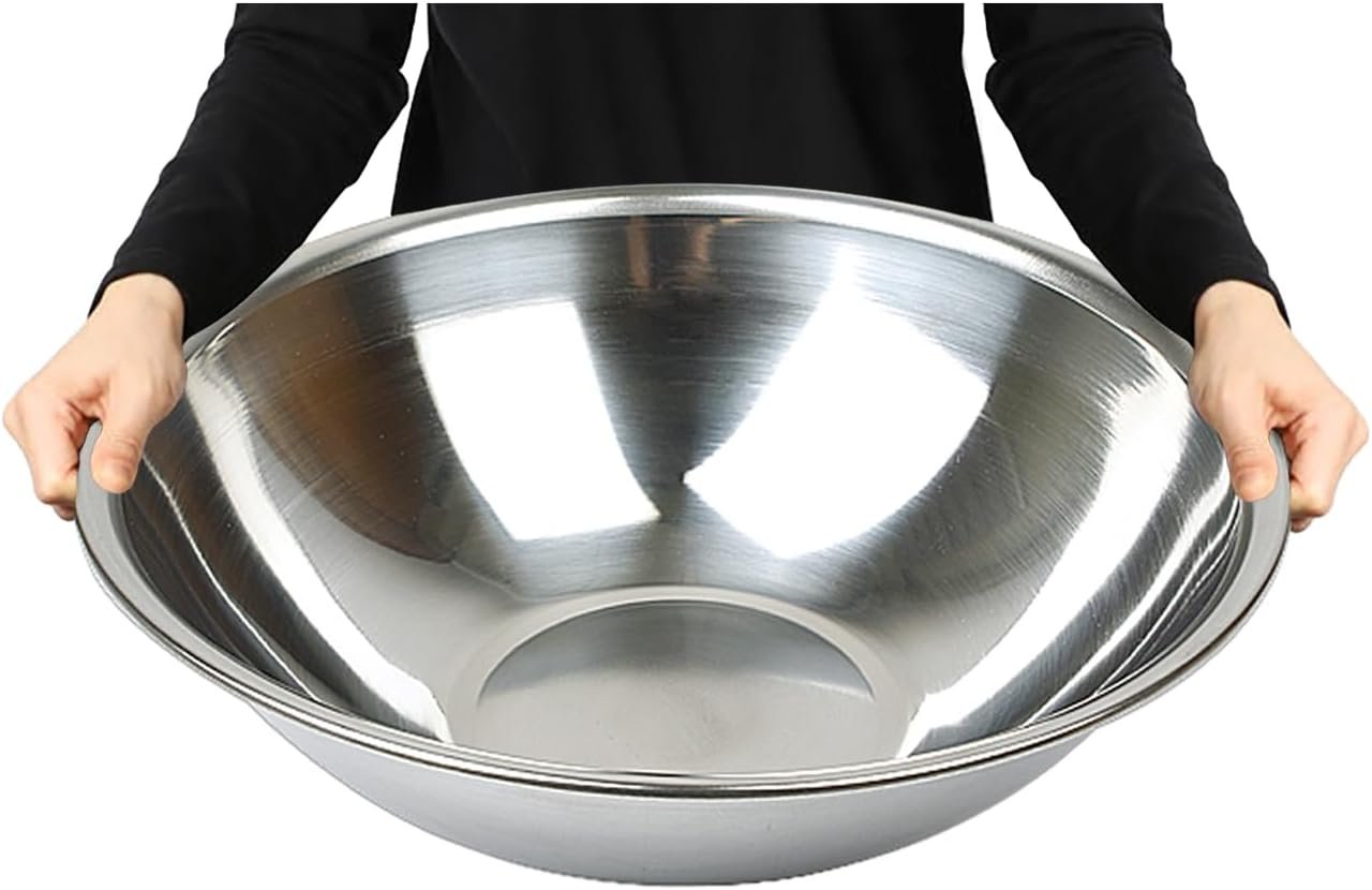 Overall, this extra large stainless steel mixing bowl is a great addition to any kitchen, offering a durable and efficient solution for large-scale food preparation. Its comfortable grip and wide bottom make it easy to use, while its stainless steel construction ensures easy cleaning and maintenance.