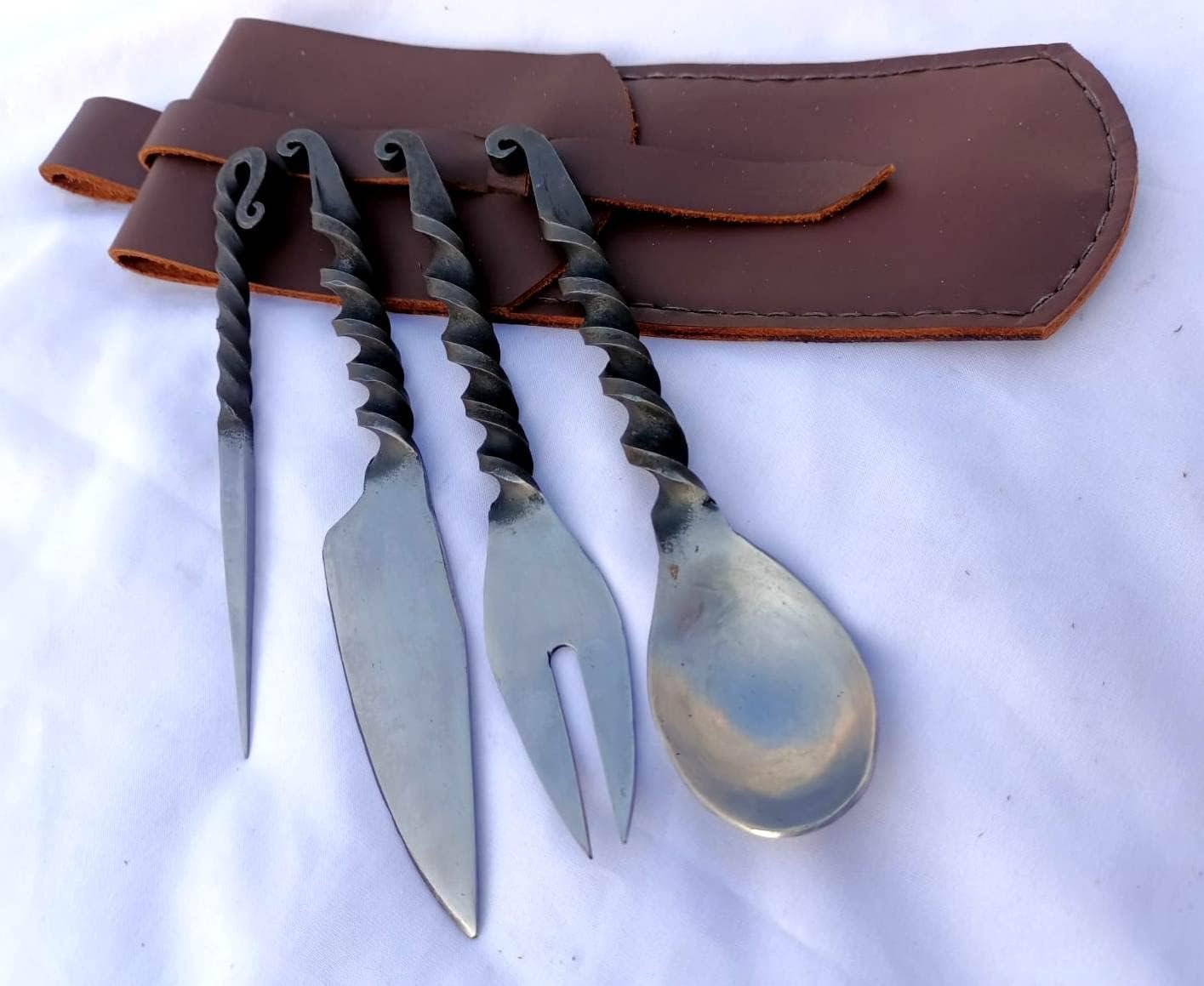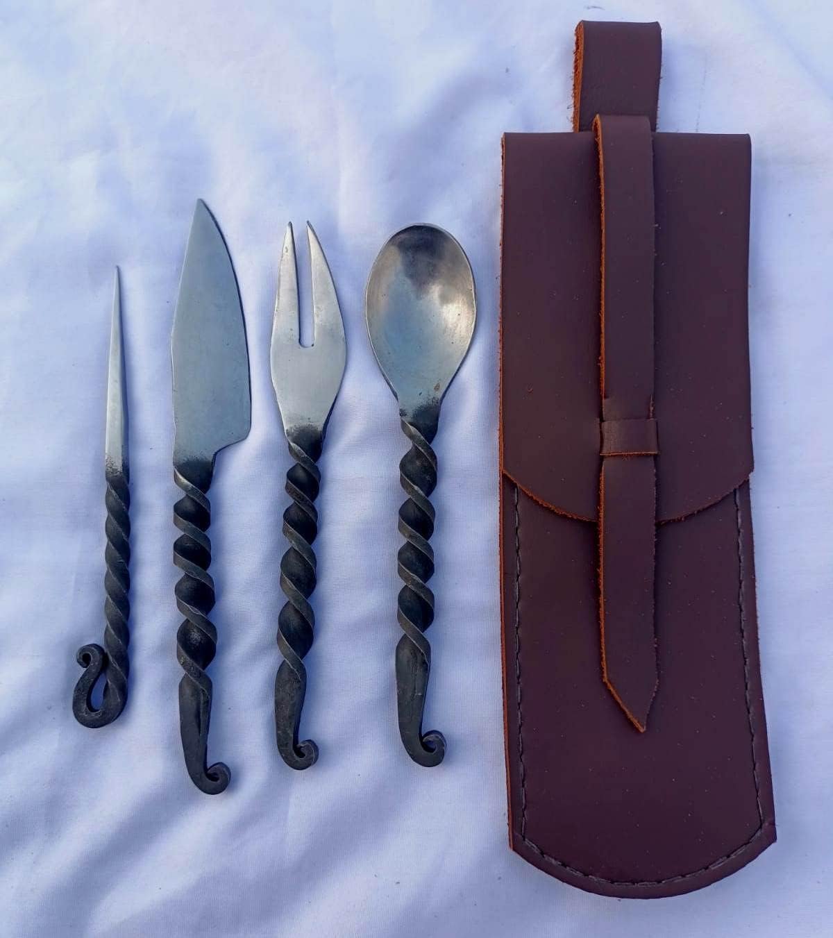 Step back in time with this hand-forged medieval twisted dining hall eating/feasting utensils set. Crafted with meticulous attention to detail, this functional 4-piece set includes a fork, knife, spoon, and food stick, allowing you to dine like royalty. Forged from high-quality materials, these utensils are built to last. The twisted design adds a touch of rustic charm, while the genuine leather pouch ensures convenient carrying and storage.