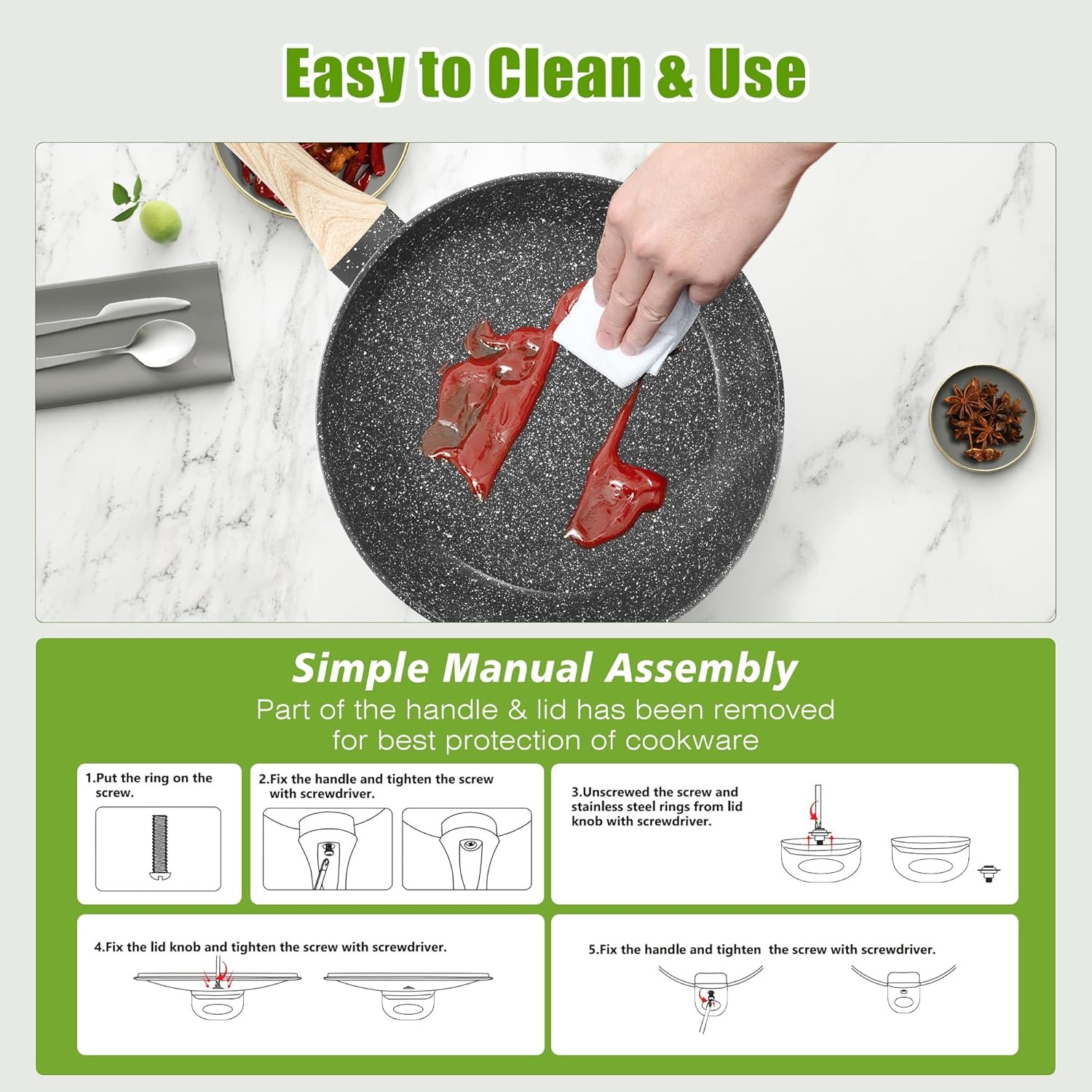 • Easy to Clean and Use: The cookware is easy to clean by hand and requires minimal oil for cooking, making it ideal for a healthy, low-fat diet.