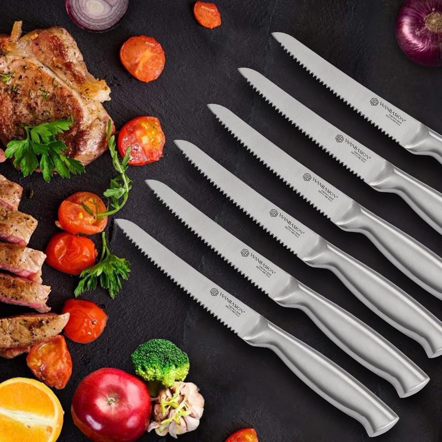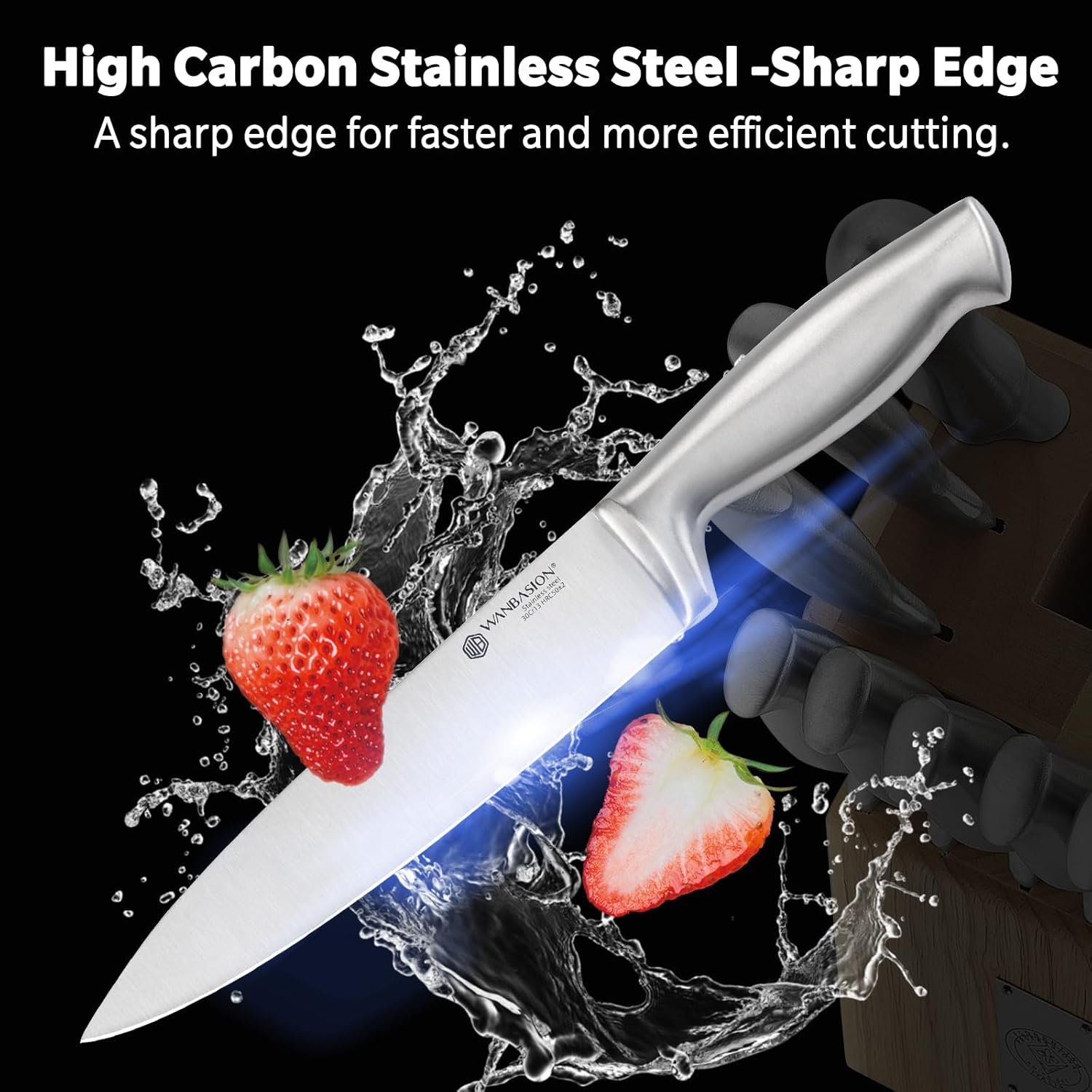 Wanbasion 14Pcs Kitchen Knife Block Set with Sharpener, Sharp Kitchen Knives Set with Block, Stainless Steel Knife Set with Block Dishwasher Safe Silver