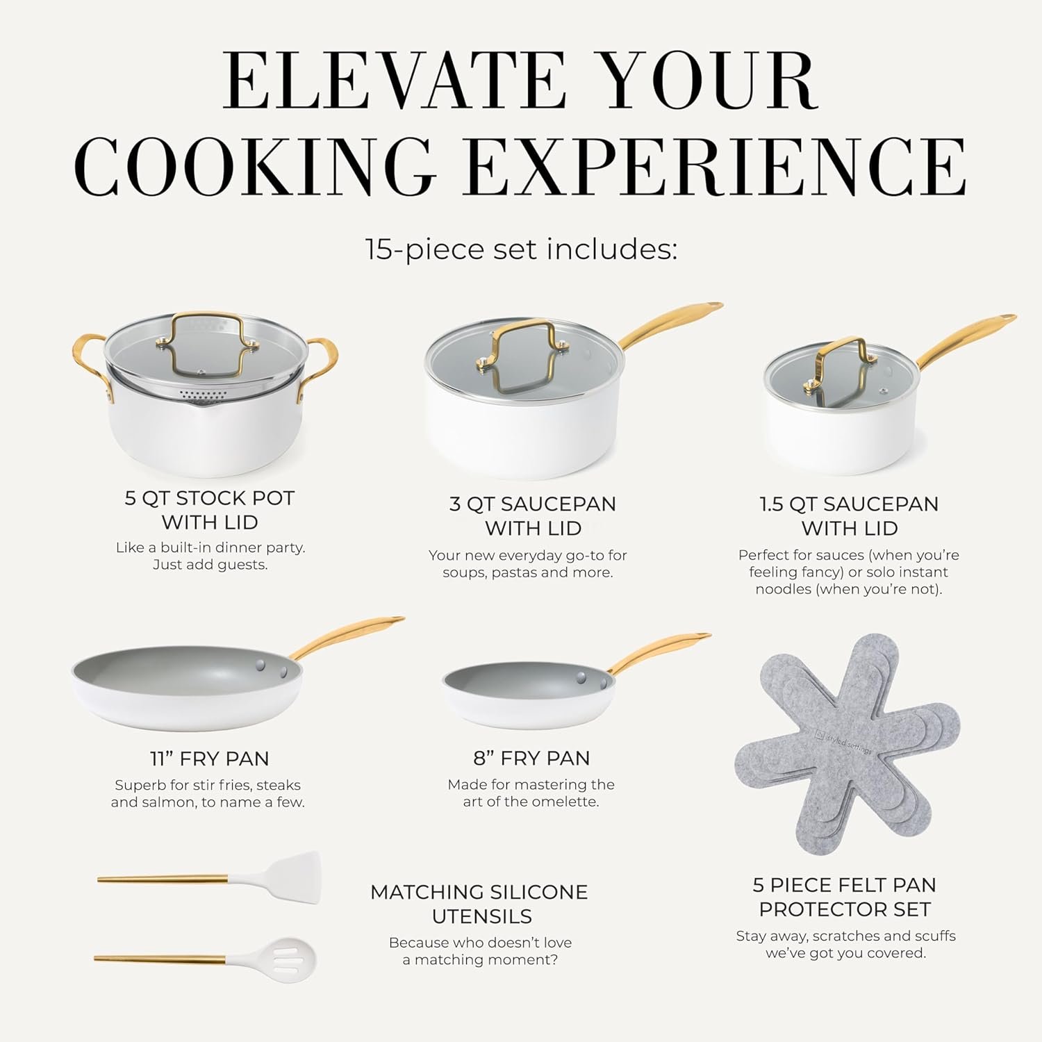 Meet your new breakfast, lunch, and dinner partners-in-crime: Our 15 PC white and gold pots and pans set includes a 5 quart white cooking pot with strainer lid, 1.5 and 3 quart saucepans with lids, 8” and 11” white and gold pan set nonstick, matching gold and white silicone cooking utensils, and 5 pan dividers; pairs perfectly with any white and gold kitchen accessories, cream kitchen accessories, and brass kitchen accessories.