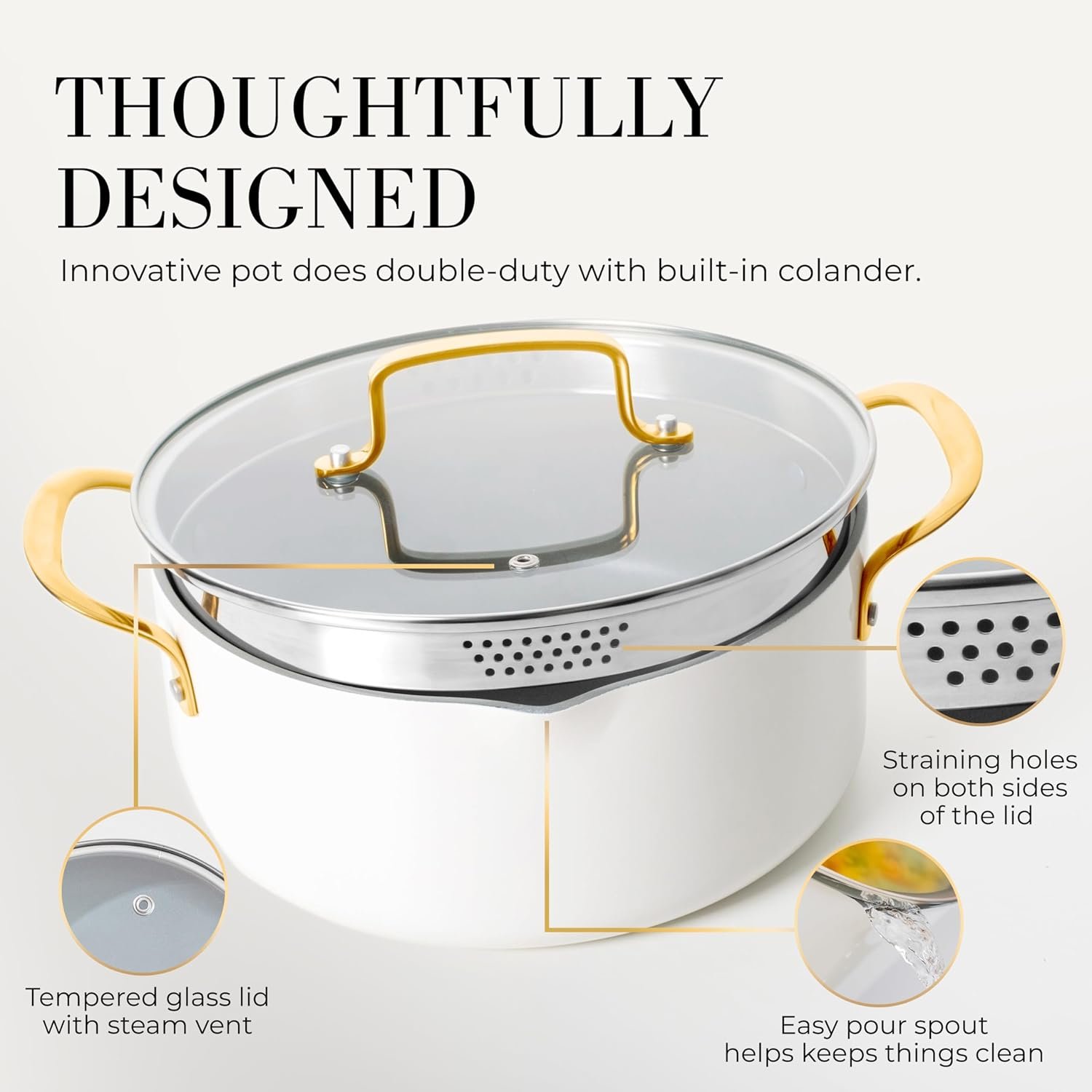 • 5 quart white cooking pot with strainer lid
