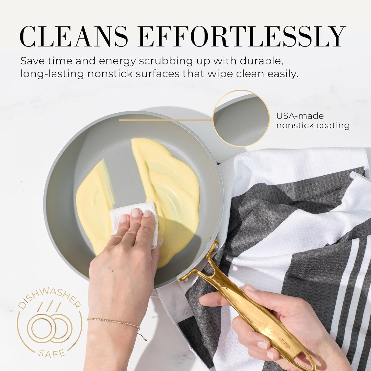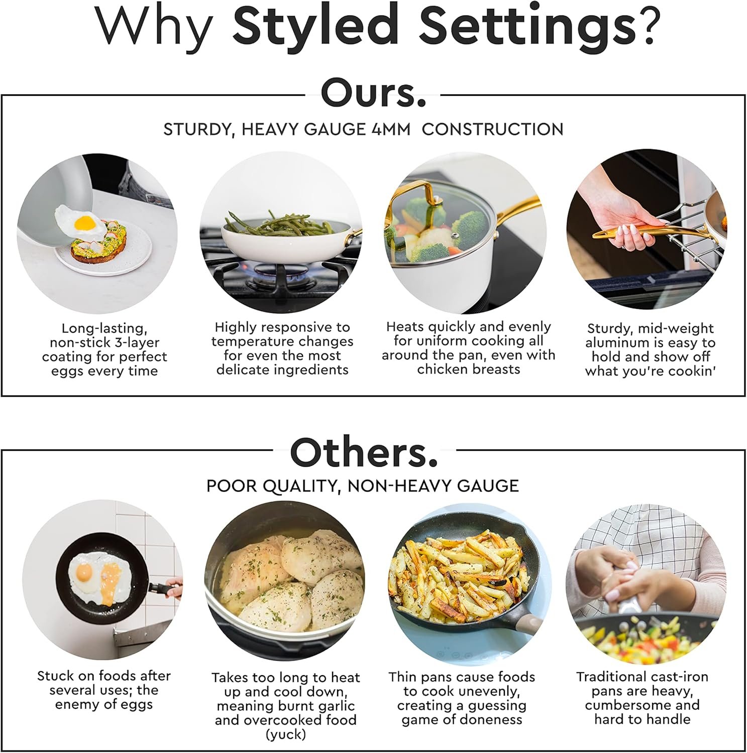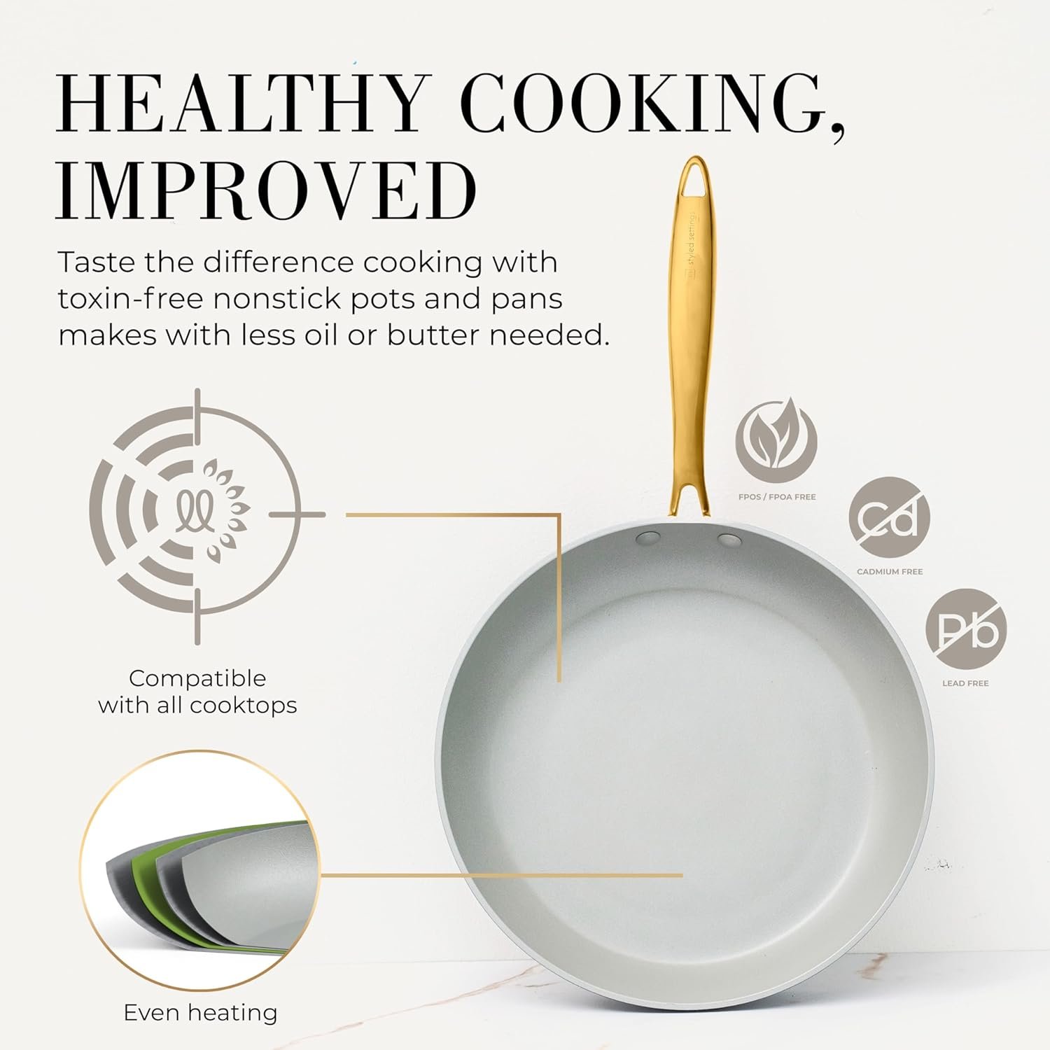 Our white and gold cookware set is crafted with a durable, premium 3-layer nonstick coating made to last and look great with no sticking. The ultimate oven safe pots and pans set, it’s perfect for cooking with responsive, even heat. Additionally, our gold and white non-stick pots and pans are made from superior materials that contain no harmful chemicals, making it a healthy and worry-free cooking option.